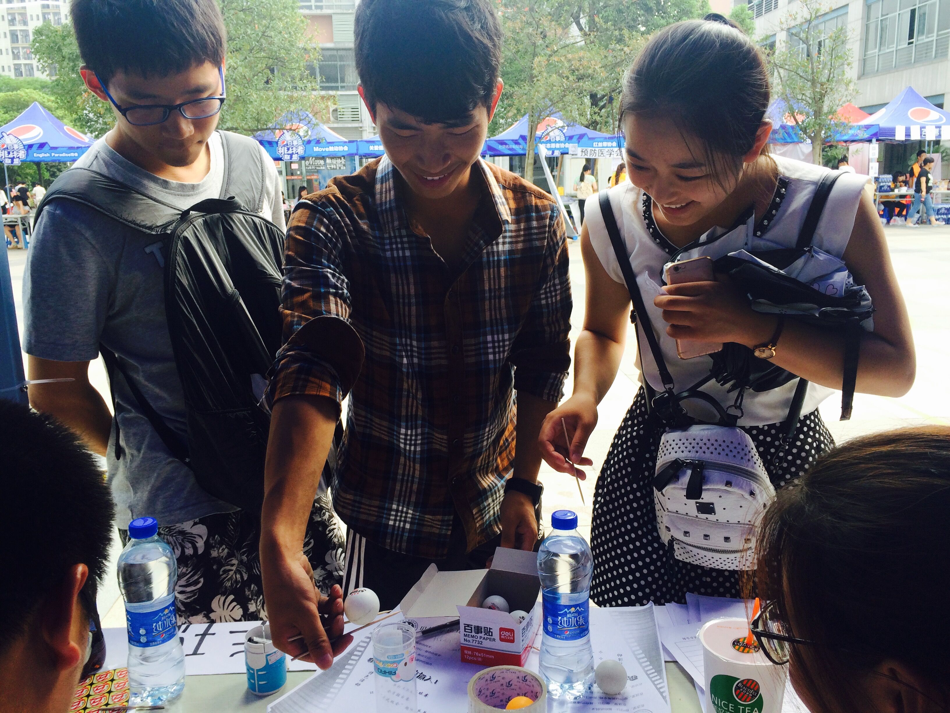 本次活动现场人潮涌动,游戏内容精彩纷呈:野百合艺术团的“疯狂KTV”——随机抽取一张歌词并唱出原曲,即可获得野百合艺术团的logo,这为爱唱歌的同学们提供了一个大展身手的机会;“绿之翼环”保协会的“拯救地球”——在一分钟之内用筷子将水中的弹珠夹到指定位置,参加游戏即可获得社团logo,另外,夹30个以上的弹珠,将赠送环保袋一个,显然这也吸引了同学们的目光,使大家在游戏中锻炼了动手能力;贝斯特乒乓球协会的“飞黄掠水”——在规定的40秒内,参赛者要将拿到的乒乓球从第一个杯子吹到第六个杯子,要一个一个吹至杯子内,球不可以跳过杯子或滑落至桌子上,成功通关,即可获得社团logo作为奖励,这考验的是大家的力度控制及方向控制,同学们全然不顾淅淅沥沥的雨,纷纷跃跃欲试,参与者皆全神贯注,周围的看客们也都暗暗加油;B.D.服务社的“星云瓶制作”——同学们用颜料,棉花,玻璃瓶打造如梦如幻的星云瓶,制作完成即可得logo,这更是云集了动手能力极强的杭师学子们,小小的星云瓶不仅能体现同学们的色彩搭配技艺,更考验了大家的耐心与细心。除了各社团别出心裁的游戏之外,活动现场更有其它社团成员们的热舞助兴,音乐响起的瞬间便吸引了周围同学的目光,将现场的氛围推向高潮。
