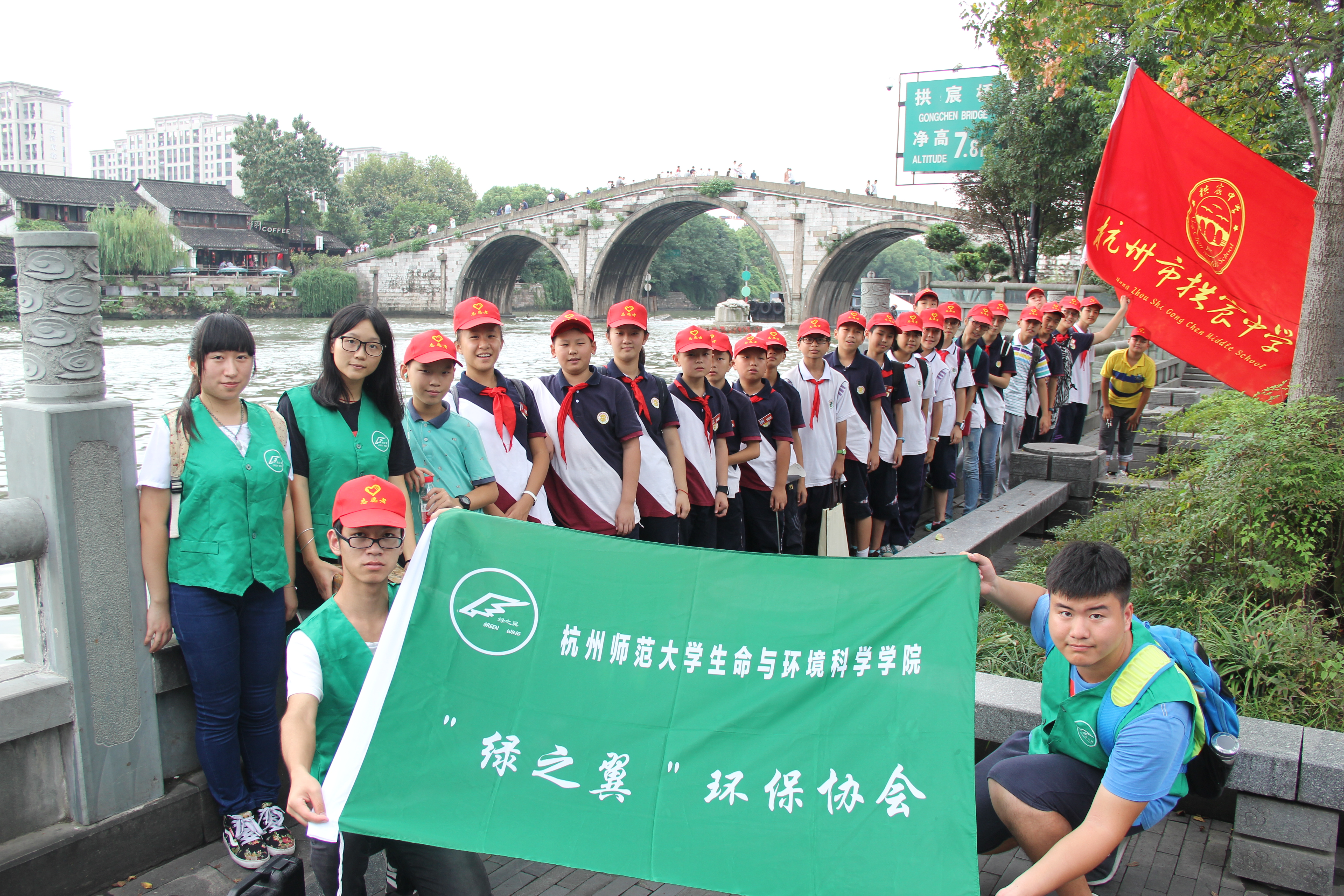 "绿之翼"环保协会成员在拱墅区拱宸桥联合举办“徒步京杭大运河,绿色迎国庆”环保宣传活动。