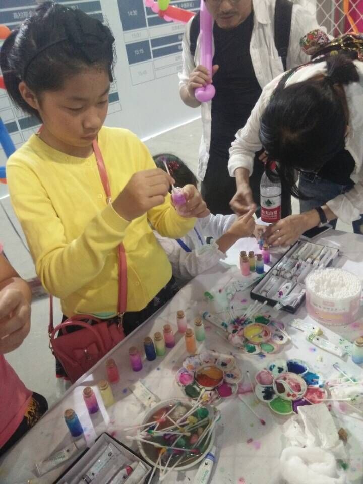活动地点安排在会展中心B馆负一层,因为地点偏僻,一开始人流量并不大,参加活动的人也是寥寥可数。但是,工作人员们并没有因此而丢失信心,他们坚信,是金子总会发光的。因为活动的精彩有趣,B.D.服务社被一传十,十传百,到展位制作叶脉书签和星云瓶的参与者渐渐多了起来,再加上有几个热心可爱的小朋友帮忙“拉客”,很快B.D服务社展位前气氛高涨,热闹非凡。到场参加活动的,不论小孩还是大人,都在很热情认真地制作手工作品,充分地展现了他们的动手能力和创意,最终制成了一张张精致美丽的叶脉书签和一个个漂亮的、仿佛将星空定格的星云瓶。