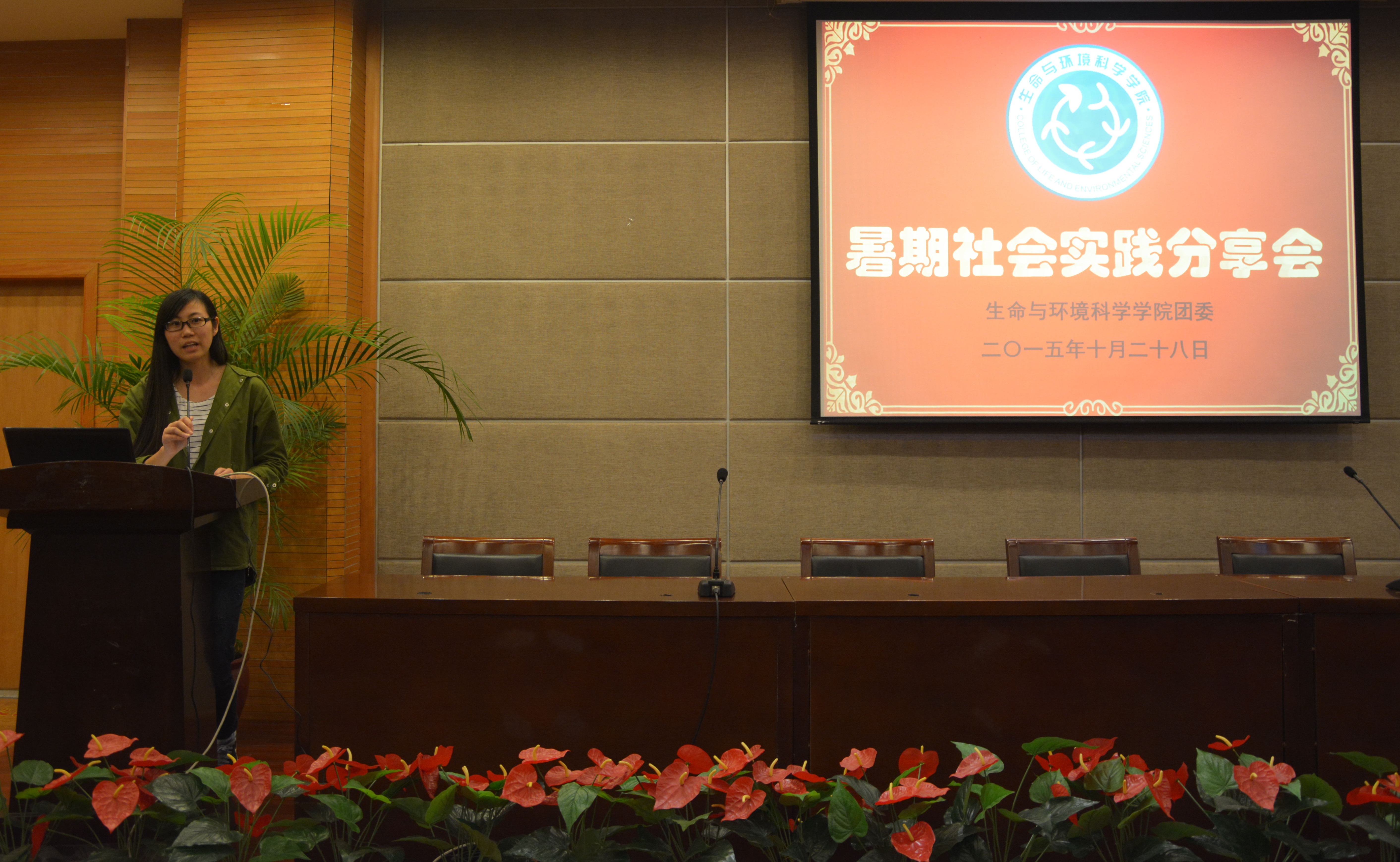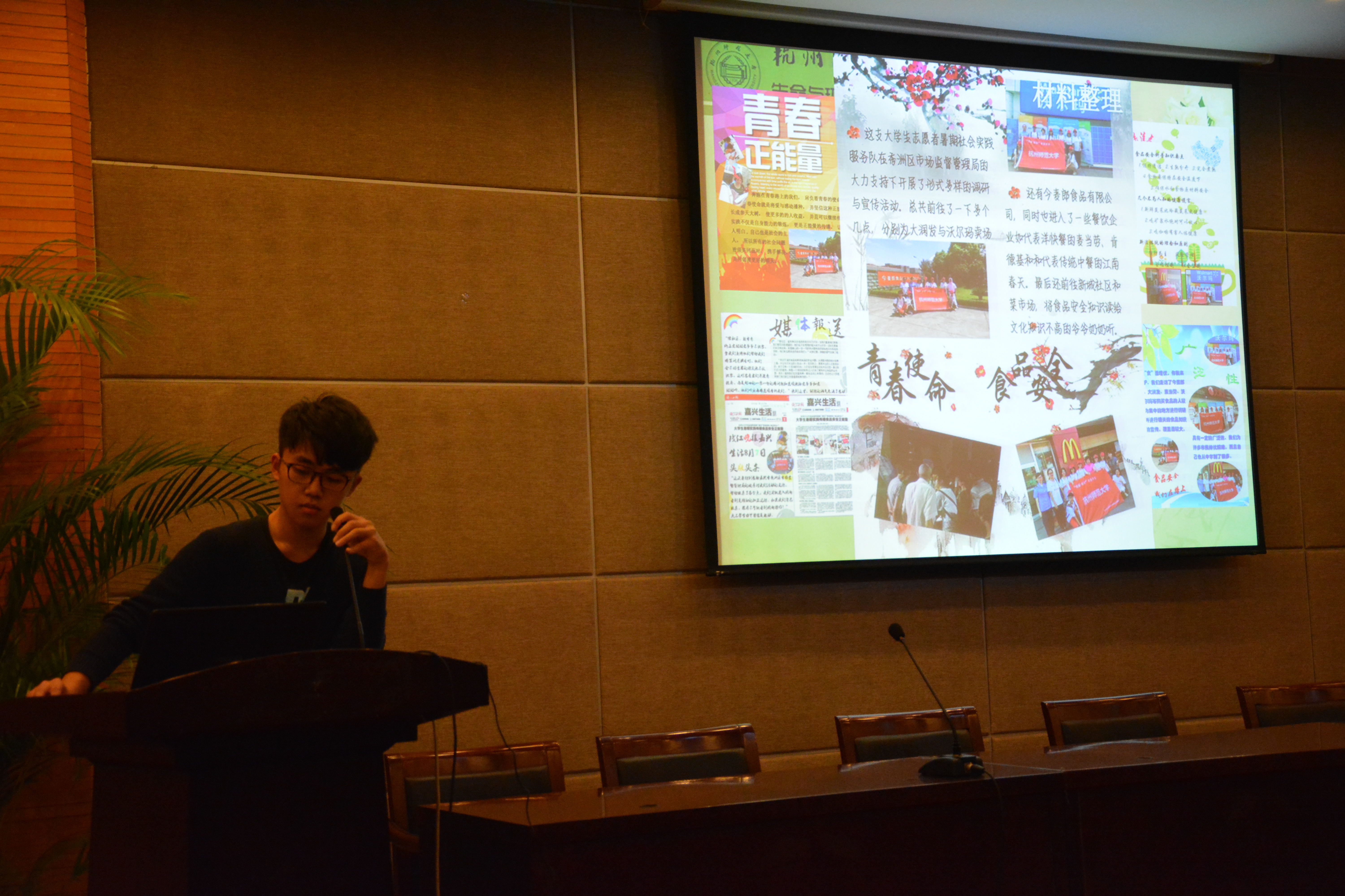 本次会议分为三个部分。首先,由主持人胡镜大致介绍暑期社会实践的具体概念。紧接着,食品安全小分队的代表开始讲述他们关于油炸食品的课题。在暑期实践过程中,他们去了肯德基等餐厅调查了油炸食品的安全性,也对新城社区、菜市场等生活区中的食品进行了检测。调查完毕后,这支小分队举办了一次交流会,并且制作成了十张关于此次实践活动的海报。他们的活动也得到了嘉兴市秀洲区食安安全局的大力支持,并被钱江晚报报道。第二个出场的是清洁水资源小分队代表,这支小分队主要对钱塘江北支源头六股尖以及南支源头开化进行了生态环境评估。同时,他们也对周边土壤进行了调查。除了检测水质制成报表之外,他们还与青少年宫的小学生们共同完成了植物标本制作的活动。这个活动受到了全国青少年发展基金会的项目资助,并与杭州市优科豪马公司合作,活动被多家媒体报道。而第三支队伍,空气清新小分队与绿色浙江合作,开展了居室空气的质量检测活动。此次他们调查的地点选在了杭州西湖区、下城区以及拱墅区。他们分成了多个小组,进入居民的家中用酚试剂分光光度法进行检测。