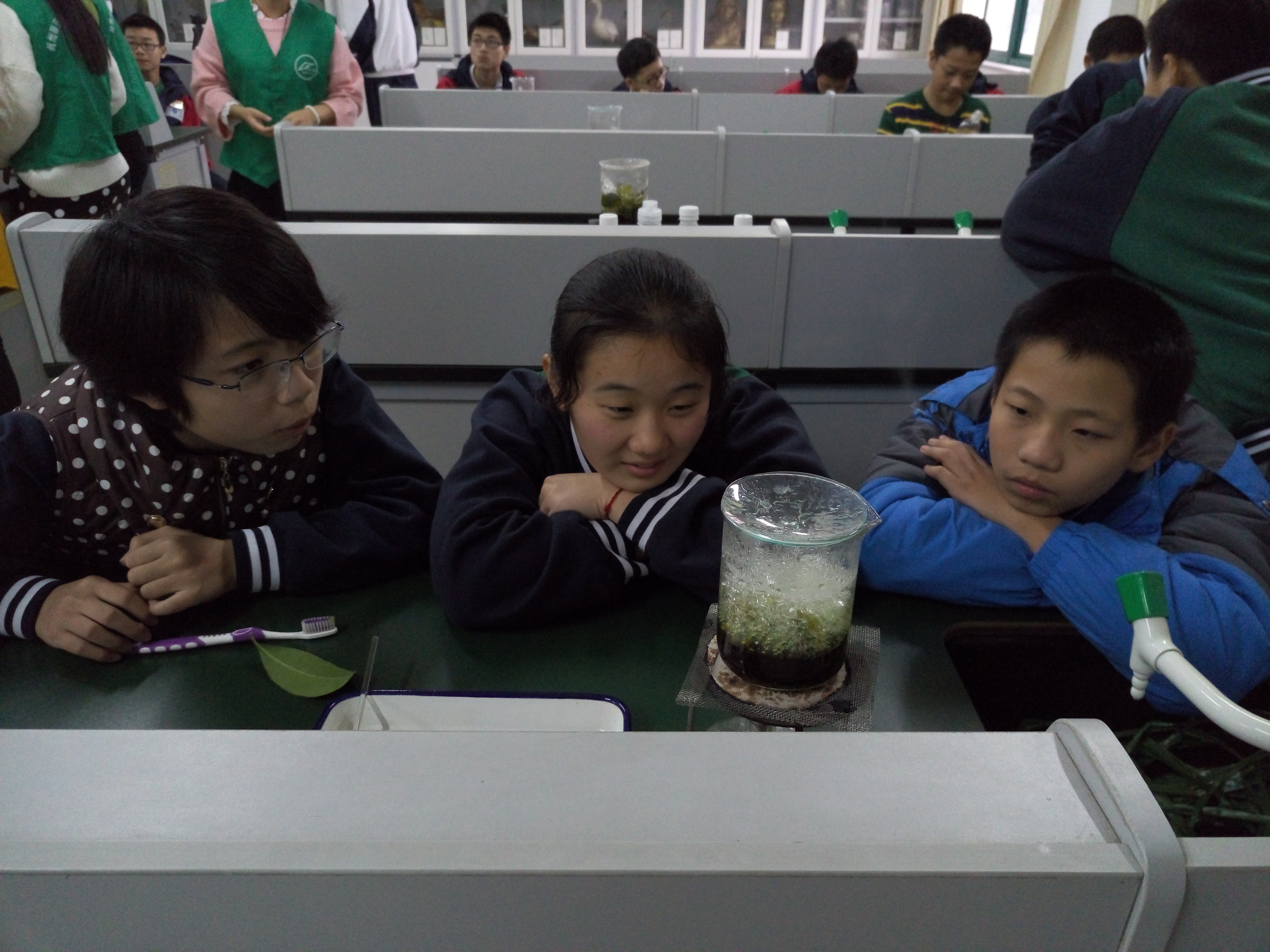 天气虽寒,但是拱宸中学环保社团同学的热情不减。当同学们看到协会成员进入社团活动教室,同学们便立即认出了一个多月前带领他们参加环保宣传活动的科研部副部长徐境,都热情地欢迎四位大姐姐的到来。在社团负责老师和其他三位成员的协助下,徐境同学首先简单地为同学们介绍了叶脉书签的制作原理、方法,同学们都认真倾听,做好记录,接着便开始制作叶脉书签。考虑到使用酒精灯和氢氧化钠过程中所存在的安全问题,协会成员和指导老师负责煮树叶的工序,同学们都围坐在实验台旁,全神贯注地看着,等待着;随后,协会成员将处理过的树叶用镊子夹出,放在盛有清水的碟子上,同学们早已跃跃欲试,手中拿着废弃的牙刷,小心翼翼地拍打着叶肉,生怕将叶脉破坏;协会四位成员和指导老师则在旁边指点。经过近半个多小时的努力,一枚枚精致的叶脉书签在同学们的手中诞生。同学们拿着书签,开心地和协会成员合影留念,阵阵笑声从教室中传出。