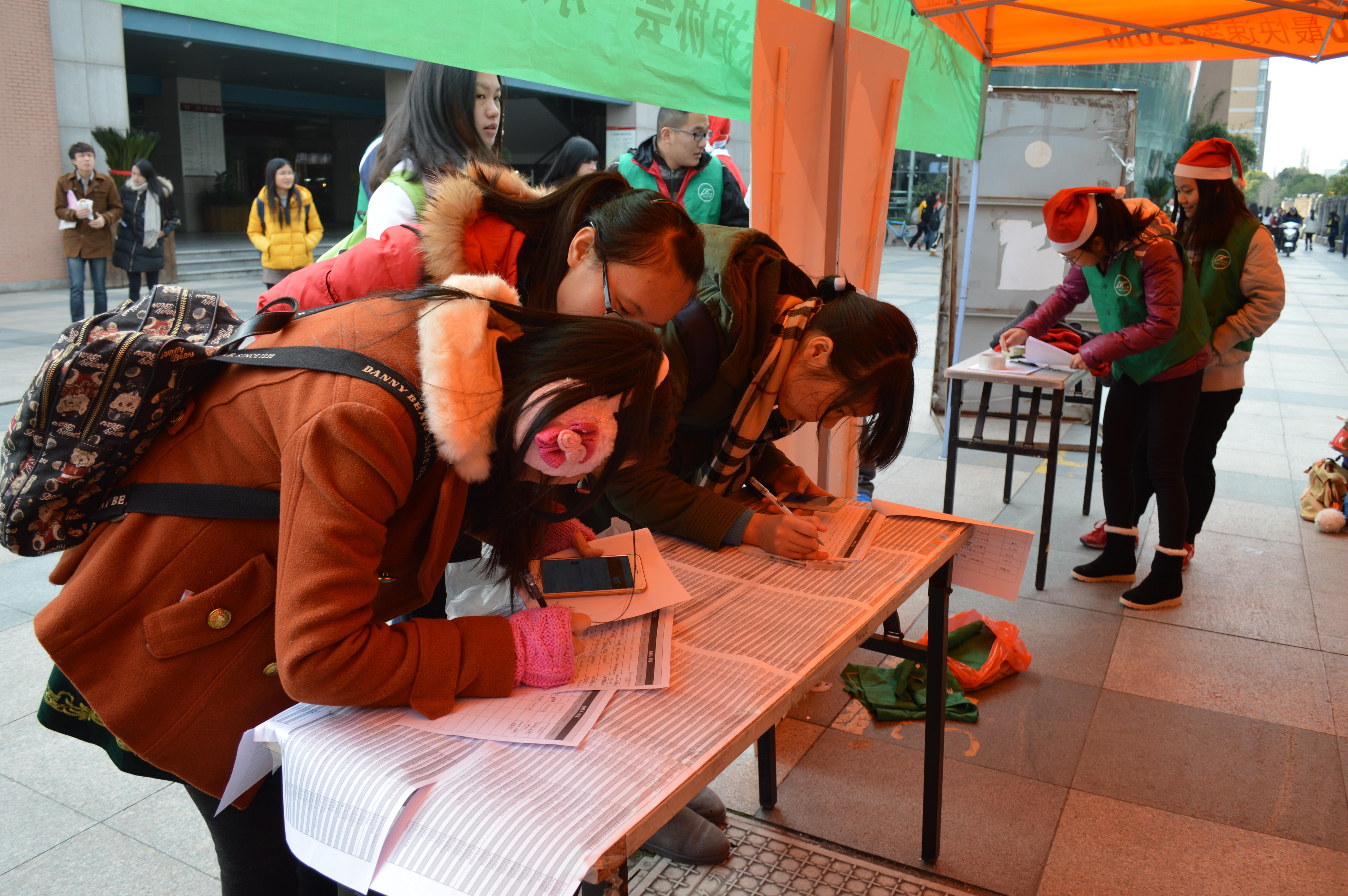 活动当天天气虽冷,但绿之翼人的活动热情不减。会长、副会长、部长以及小干事们都穿上了绿马甲,戴上了圣诞帽,让大家提前感受圣诞氛围。干事们带着高校名单,向过往的同学介绍水果贺卡的活动意义、参与方式,并且耐心地帮助同学们寻找学校信息,让同学们能尽快填写信息单,少吹冷风。同时,也有不少同学通过绿之翼的宣传活动,早早知道水果贺卡活动,一下课便赶到活动场地填写祝福信息,并且感叹水果贺卡这个活动有意义又温暖,这让"绿之翼"的全体成员都感到欣慰。短短两个小时的外场吸引了很多前来为远方朋友送去祝福的同学,如果远方的同学能看见他们认真填写祝福的样子,一定会感到温馨。