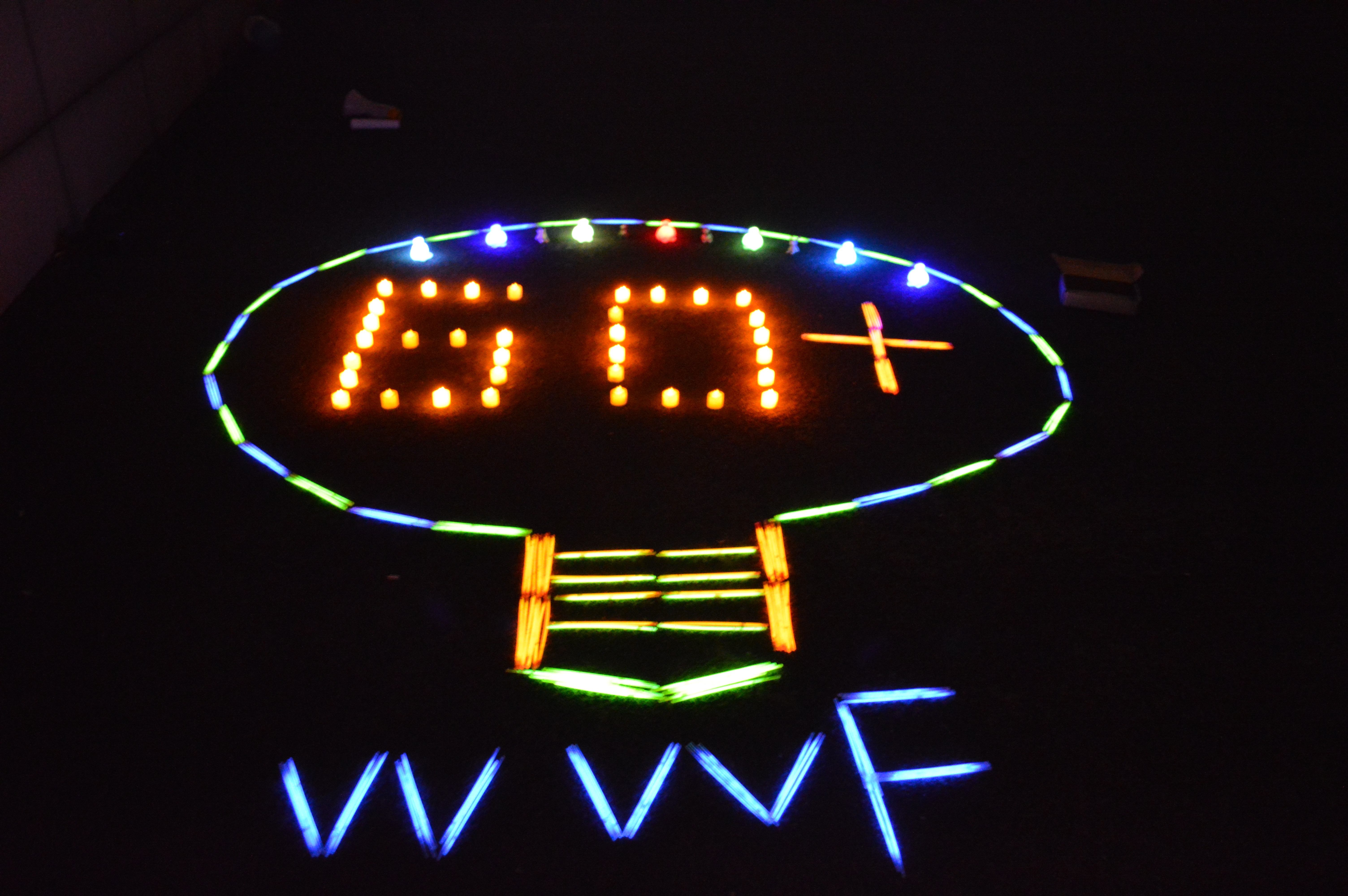 本次活动旨在倡导节能减排,让师大学子关注能源问题。我们在杭师校园选取了四个没有路灯的地点用小蜡烛布置了环保知识竞答、正话反说、在高低杠上吃洋葱圈等小游戏来吸引同学们走出寝室、熄灯一小时。参与小游戏并过关的同学可以赢得一个荧光手环,最后根据手上荧光手环的数量来换取不同的小礼品。这些有趣的小游戏以及与众不同的游戏环境吸引了许多同学的参与,让同学们愿意走出寝室,在夜色中伴着烛光享受没有亮眼灯光的一小时。同时,我们还准备在宿舍楼利用不同寝室的亮灯和熄灯摆出了60+的图案,同时协会成员们就地取材,用布置游戏场地的夜光灯和荧光棒摆出了一个灯泡中显示60+的图案。
