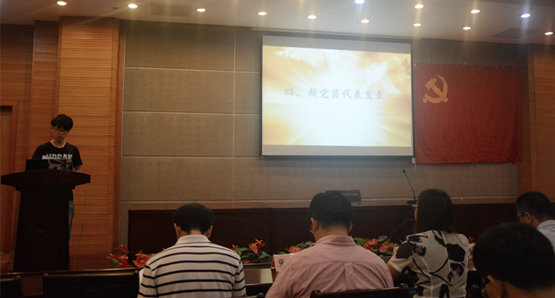 伴随着国际歌,全场呈现出慷慨激昂的氛围。紧接着院党委副书记金岳祥宣读了新党员名单,随后院党委书记周春儿带领全体党员面向鲜艳的党旗,高举右拳,庄严宣誓,“我志愿加入中国共产党,拥护党的纲领,遵守党的章程,履行党员义务,执行党的决定,严守党的纪律,保守党的秘密,对党忠诚,积极工作,为共产主义奋斗终身,随时准备为党和人民牺牲一切,永不叛党。”郑重的誓词,慷慨激昂的宣读,提高了大家对党员义务权利的认识,坚定了大家为共产主义奋斗终身的理想和信念。接着,胡镜同学和田兰馨同学分别代表新党员和老党员上台讲话,他们在演讲中都阐述了要不断提高自身的思想政治素质,加强政治理论和专业知识的重要性,表达了他们自身对党无比的热爱与崇敬。并结合自身实际讲述了如何在学习生活中做好“领头羊”,如何更好地学习“两学一做”。