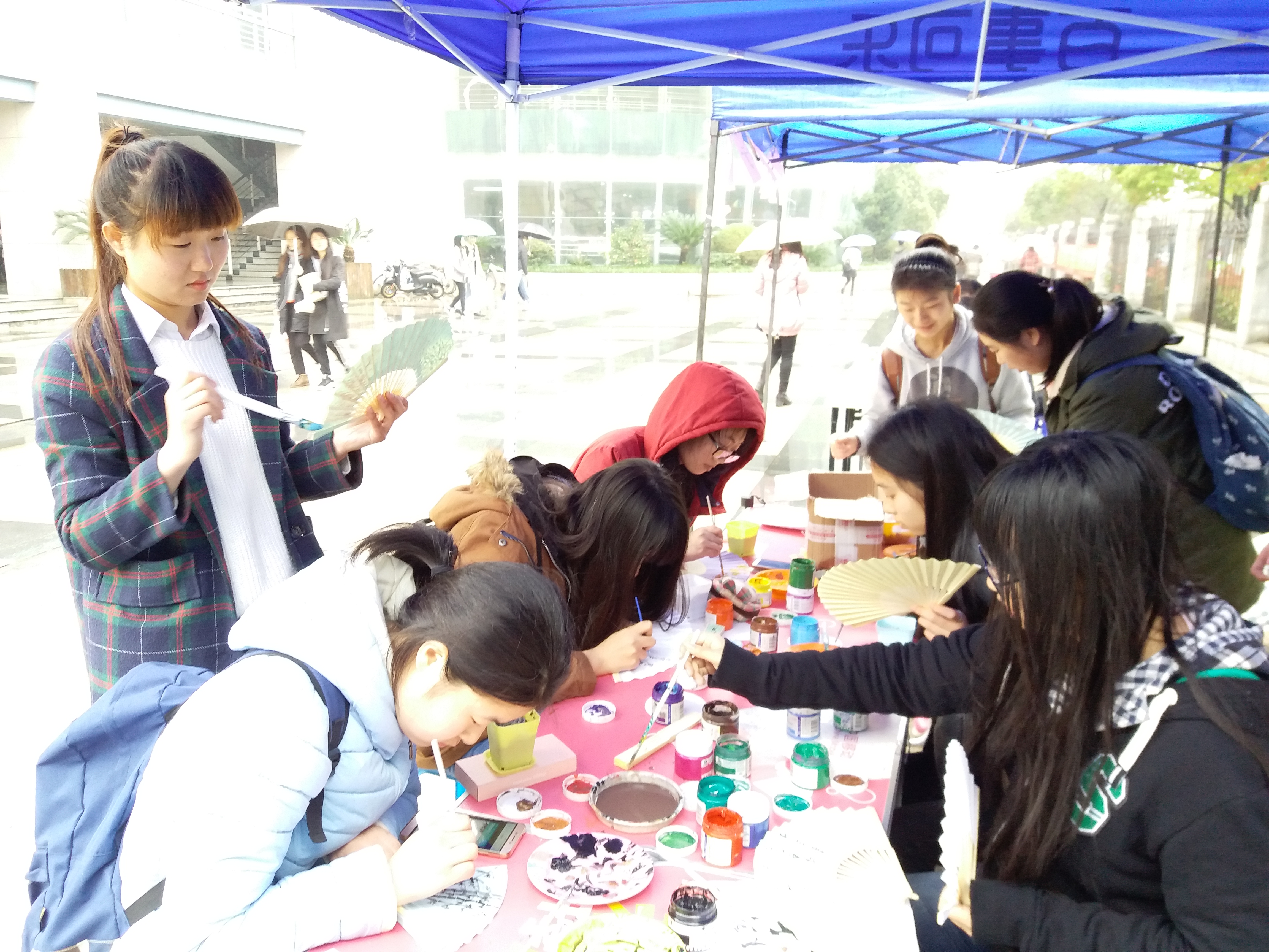 活动开始,在社团成员的引导下,很快就有一些同学前来参加。淅淅沥沥的雨声中,同学们有的专心致志地在折扇上描摹山水,再配上一首壮美的诗歌;有的沉静思索,想着如何勾勒出一幅美景。时间的脚步慢了下来,浮杂的噪音停顿下来,当你投入于笔墨间,便忘却了眼前的烦恼。正如孔子所说:“不知老之将至云尔”。