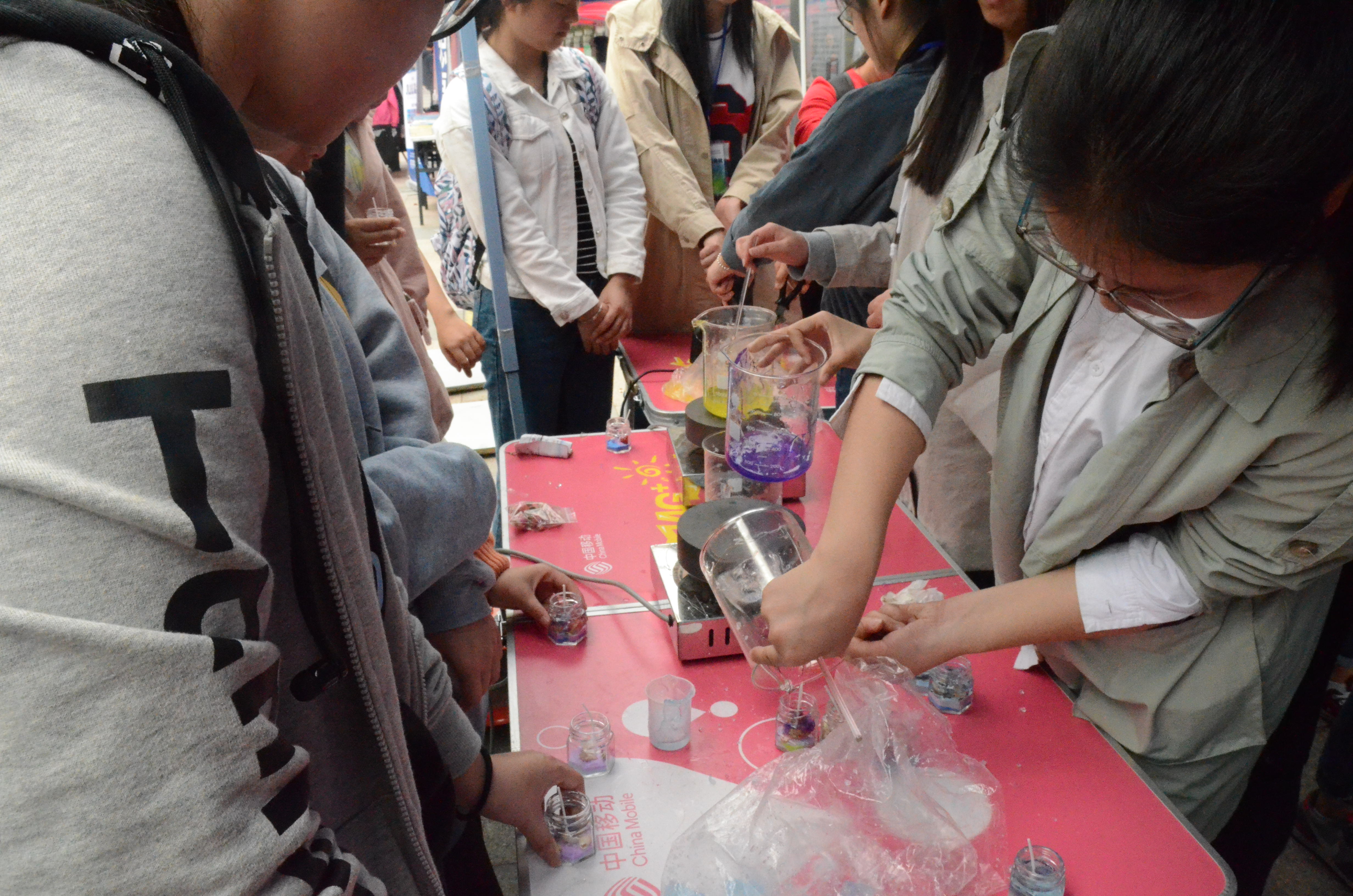 团学联办公室、设计宣传部与B.D.服务社合办此次以“果冻蜡烛”为主题的活动,希望通过对蜡烛进行创意制作,向广大师生展现利用身边的物品,也可以DIY出环保的小礼品。除此之外,“蜡烛”这一意象更是象征无私奉献的教师,表达了同学们对教师的敬佩之情。这次的生物科技节在往年的基础上不断改进,受到了广大同学的支持与欢迎。活动气氛浓烈,现场热闹非凡,每一位同学的热情都如同今天的天气般火热。同学们首先通过工作人员领取一个小玻璃瓶,之后便可以发挥自己的创意往其中加入彩砂铺底,再加入薰衣草、红巧梅等干花以及小贝壳、迷你海星等装饰品。最后也是最关键的一步,工作人员将块状的凝胶放到大烧杯中,用电炉对其进行加热,并用玻璃棒不断搅拌,使其融化成液态,根据每一位同学自己选择的颜色注入到同学们的玻璃瓶中。这样,一个简单而小巧精致的DIY果冻蜡烛就完成了。同学们脸上洋溢的笑容,仿佛回到了童年的时代。大胆的构思,用心的设计,使每一位认真投入的同学们制作出了最美丽的工艺品。
