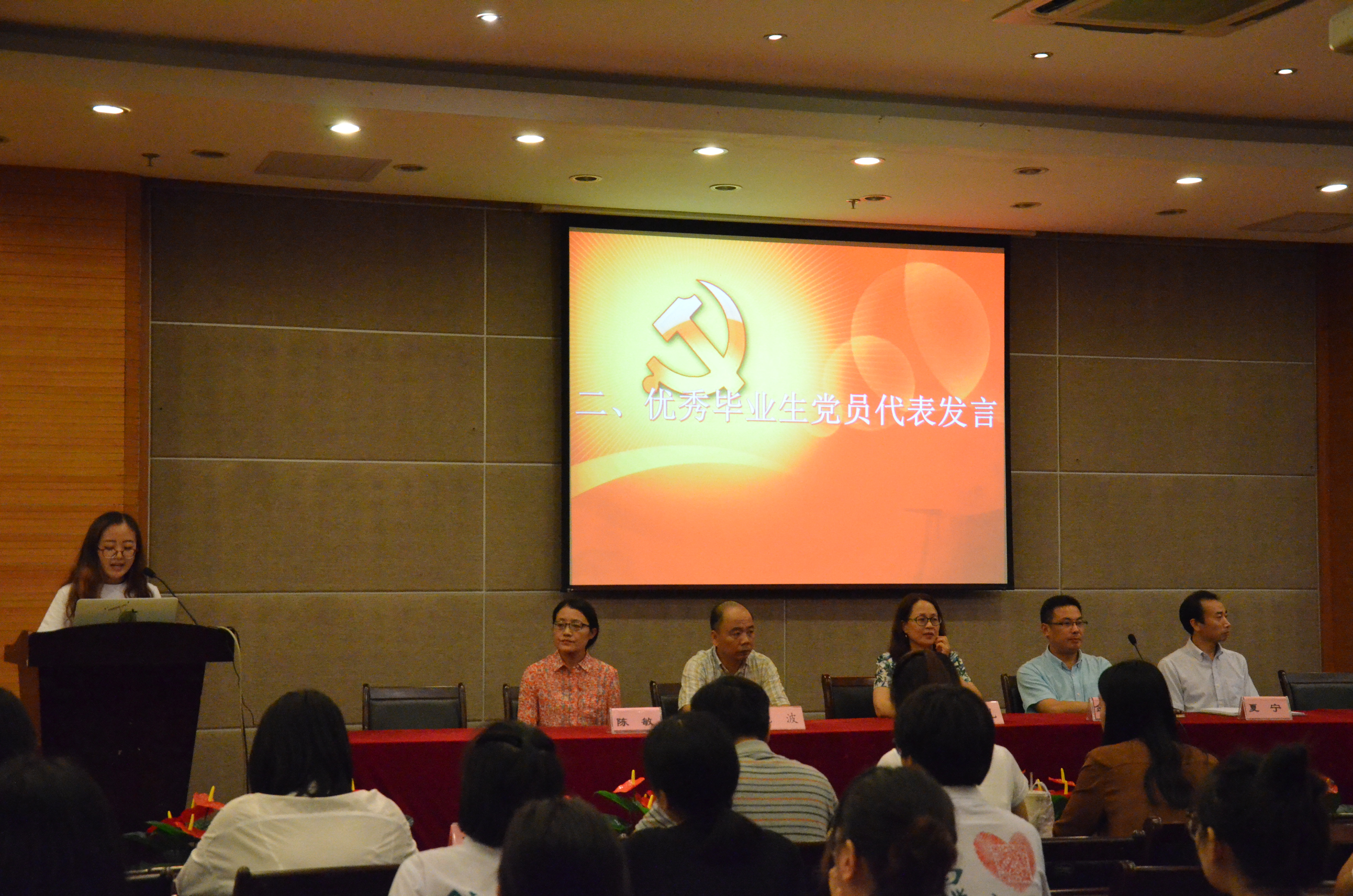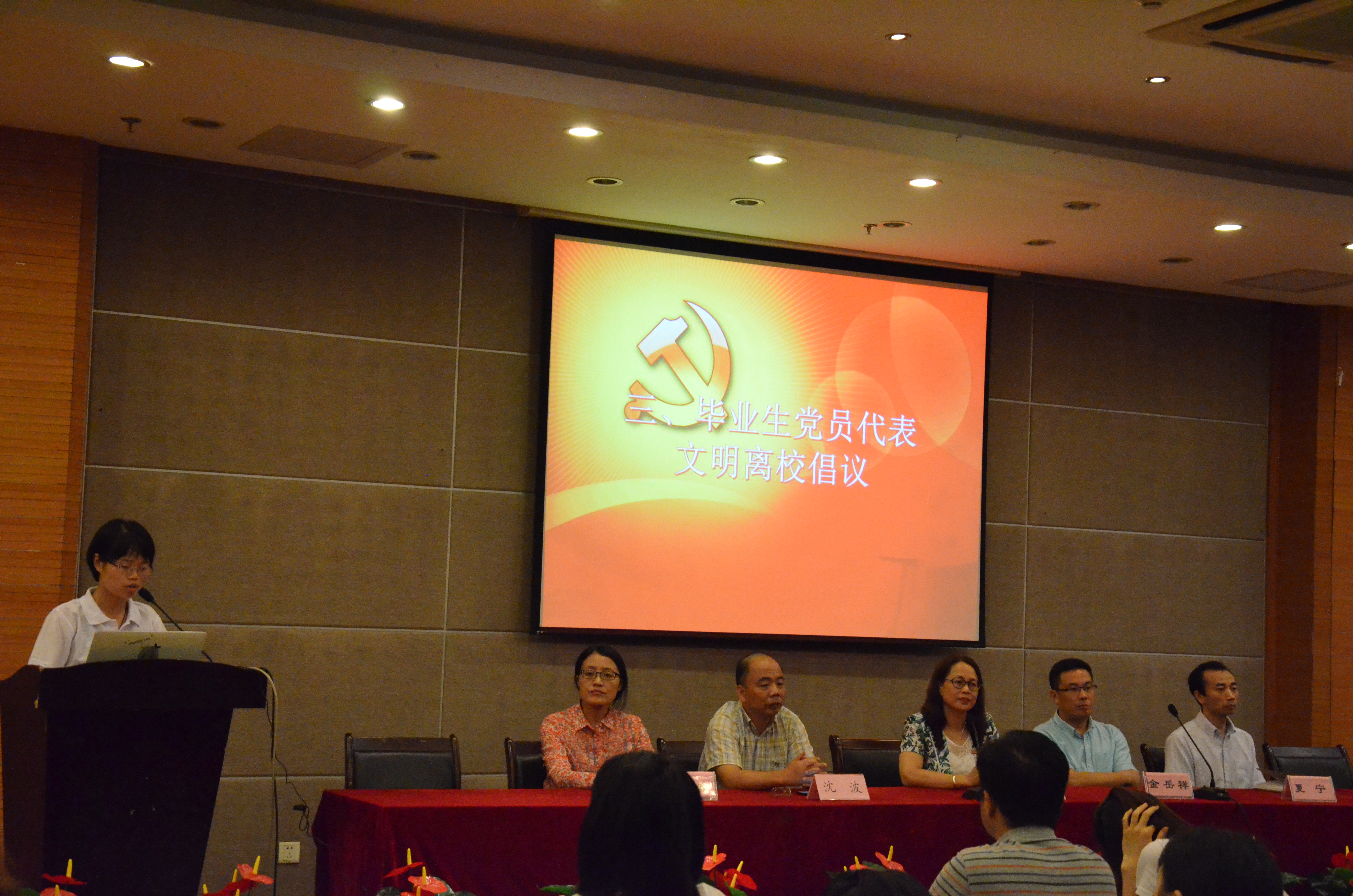 首先,全体毕业生党员在金岳祥副书记的带领下,面对党旗,重温了初次入党时许下的誓言,回忆重现,让所有在座党员再次感受了第一天入党时的激动心情,也再一次让入党誓词牢牢刻在了同学们心里。随后本科毕业生党员代表田兰馨以及研究生代表李智,各自讲述了在杭师大党员生活的点滴和感受。田兰馨讲到,大学生活就像一个熔炉,燃烧出每个与众不同的精彩人生。自己从干部到干事,从团员到党员,收获了很多,也感谢老师们一路的领导。而研究生李智则讲到无论在学校还是社会中,各位党员应始终用党的理论来武装自己,不断加强思想政治建设,提高自身的修养,不久他也要赴西藏投身志愿者工作,在未来的学习、工作中,他会不断提高自身素质与能力,不断前进。然后,陈思同学作为毕业生党员代表,发起了毕业生党员文明离校的倡议,希望2017届全体毕业生党员践行职责,做最文明的毕业生;积极总结反馈,做最理性的思考者;投身志愿活动,做最热情的奉献者;常怀感恩之心,做最有心的杭师大学子;牢记教诲,做最坚强的奋斗者。