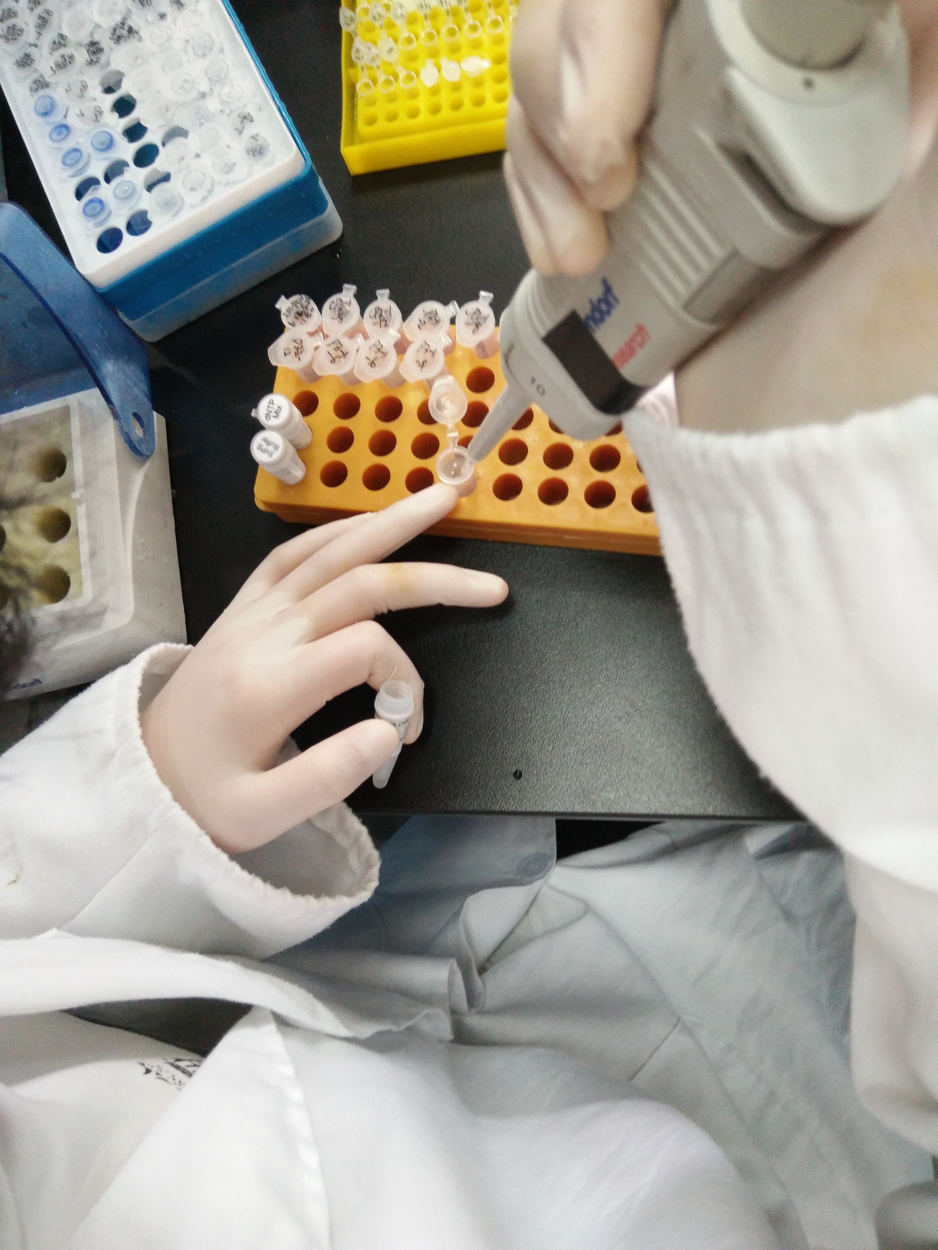 半个小时过去,讲解完毕,令人激动的动手时间到了。他们每个人都得到了任务,每个人都开始动起手来。大概,这真的是一个需要细心,更需要耐心的手工活。没有颜色的样品则是大多都附着在PCR管壁上,像小水珠乱溅,有色液体更是好看。他们生疏的模样,像是高中时代在桌上洒满了墨水,一片狼藉。或许,他们都是能干的,只是还需要练习一下。只见移液枪,一遍一遍的装着液体,反复不停的练习着,很安静,空气都变得认真起来。时间过得很快,上午即将结束,当然,他们也熟能生巧了,配制母液、分装、甚至是加入1:l的量,他们都能得心应了。在午饭之前,他们在老师的指导下,将样品放入PCR仪进行变性、退火、延伸、保温等处理,来完成漫长的扩增过程。