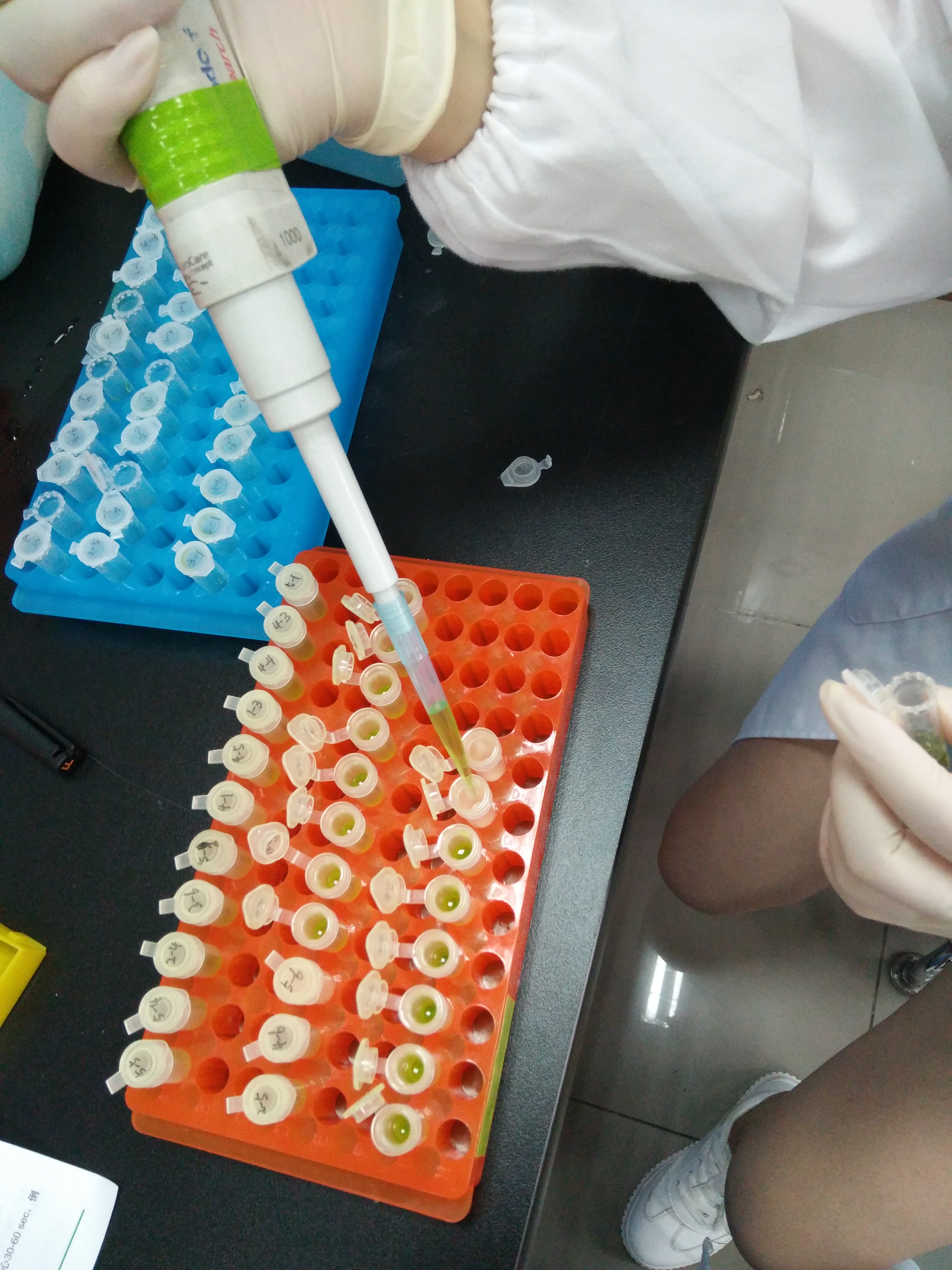 老师讲解完之后,小分队在师姐的带领下开展了今天的实验。秉承着对实验严谨认真的态度,以及对实验人员安全的考虑,在多数成员没带实验服的情况下,师姐向实验室的其他师兄师姐借了几套实验服,轻松地为小分队化解了这个小问题。由于基因组DNA和RNA在室温下非常容易降解,在试剂添加时需要非常迅速,且装有样品的PE管是浸泡在液氮中的,操作过程中需要注意安全,以免被液氮的低温冻伤。这对于初次接触这个实验的小分队成员来说有一定的难度,但是队员们毫不畏惧,他们充分的发挥了团队合作的精神,一人打开PE管的盖子时另一人迅速将试剂加入管中,充分地保证了速度。在后续的操作中,小分队用众人的智慧克服了种种困难,虽然最后提取的DNA和RNA的浓度并不是很高,但对于初次操作的他们来说已经很不错了。大家在这次实验中不光在实验操作上,同时在面对困难时的思考方式上有了很大的进步。