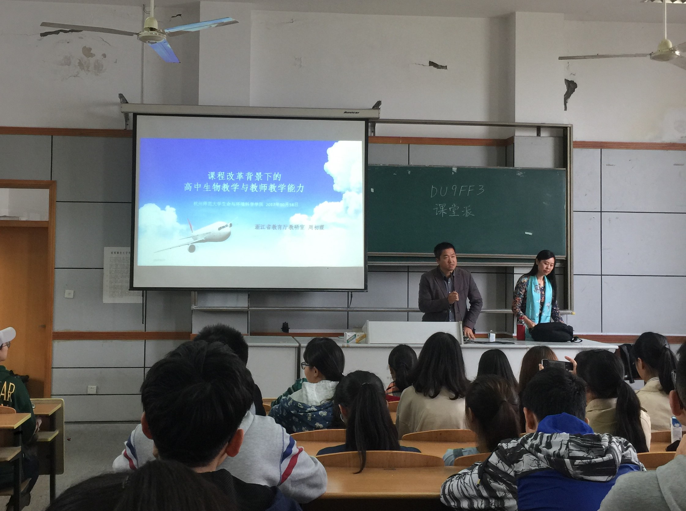 周老师先与同学们分享了一个关于动物办学的小故事,讲述了各有特长的动物们在学校全面发展的要求下学习自己并不擅长的东西,从而物极必反,导致他们的能力大不如前。周老师以此引出当今学校教学的弊端:培养学生德智体美劳全面发展的教育理念使得结果达不到预期目标。周老师紧接着以“互联网+”引出下一个话题——教育改革,周老师说:“学校不改变,我们就改变学校,于是网课就诞生了。”课程资源在网络上共享不仅仅提高了学生自主学习的能动性,还充分推动了教育改革的步伐。因此,渐渐地,课堂从以老师为主体,转变为以学生为主体,自古“学堂”二字的理解也从学生被动去上学,转变为主动去上学,于是,老师便成为学生学业历程上的脚手架,起到托扶、助力的作用。在此周老师以自身高中学英语为例子证明了这一 “学生为主,老师为辅”的观点并积极倡导以学定教、以学评教、以学助教的理念,进而引出学习金字塔,其中主动学习占金字塔底层主要部分,其清晰明了的图示给了在座每位同学极大的启发。随后,周老师以与我们2017届学生密切相关的七选三为例讲述了浙江省课程改革的历程,其中着重讲述了生物的课程改革,提倡将新型的生物教学模式融入到我们的专业课中。在讲座渐渐接近尾声时,周老师对当下的生物教学提出了四点建设性意见,即按需配比生物学科教师、加强学科课程方案建设、合理规划教学设置、加强生物学科组建设。