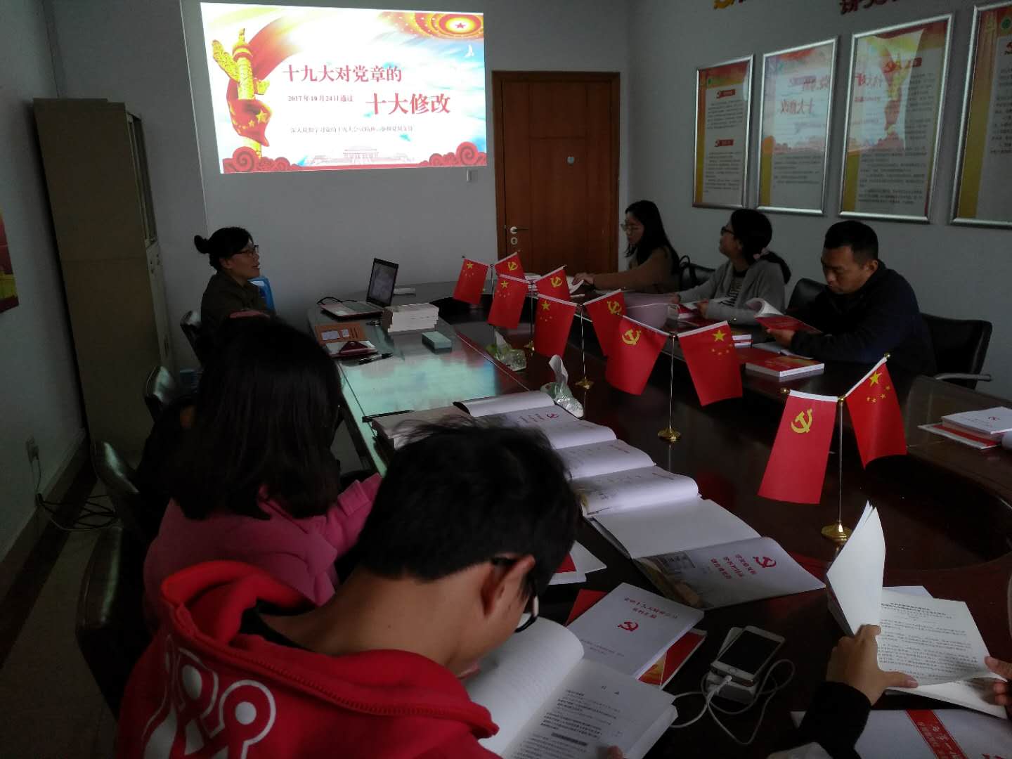 十九大党章修正案把十九大确立的重大理论观点和重大战略思想写入党章,使党章内容和报告精神有机衔接,为全党贯彻落实十九大精神提供了根本遵循。党员领到十九大学习资料,将在下一次会议上分析学习心得。