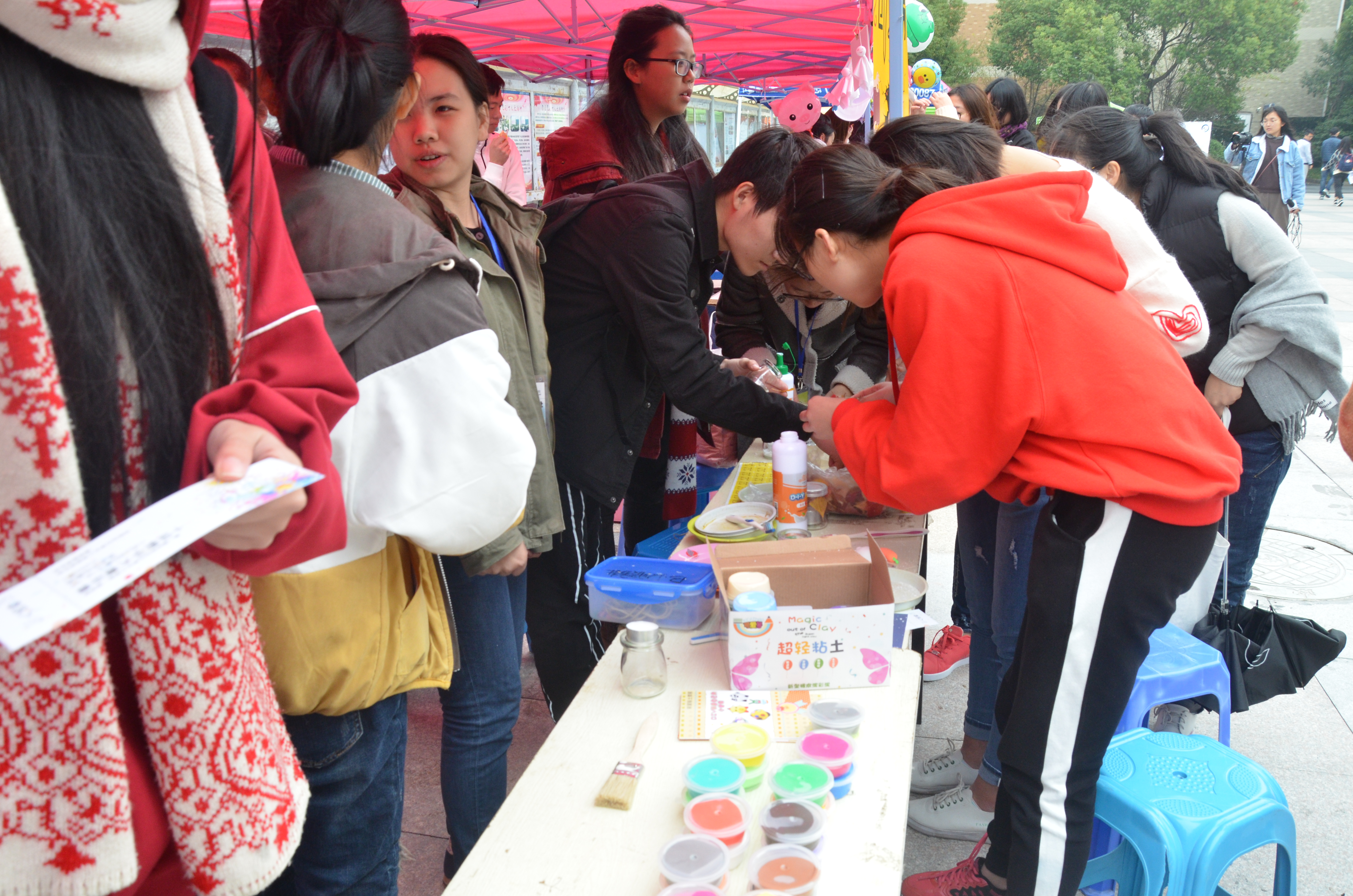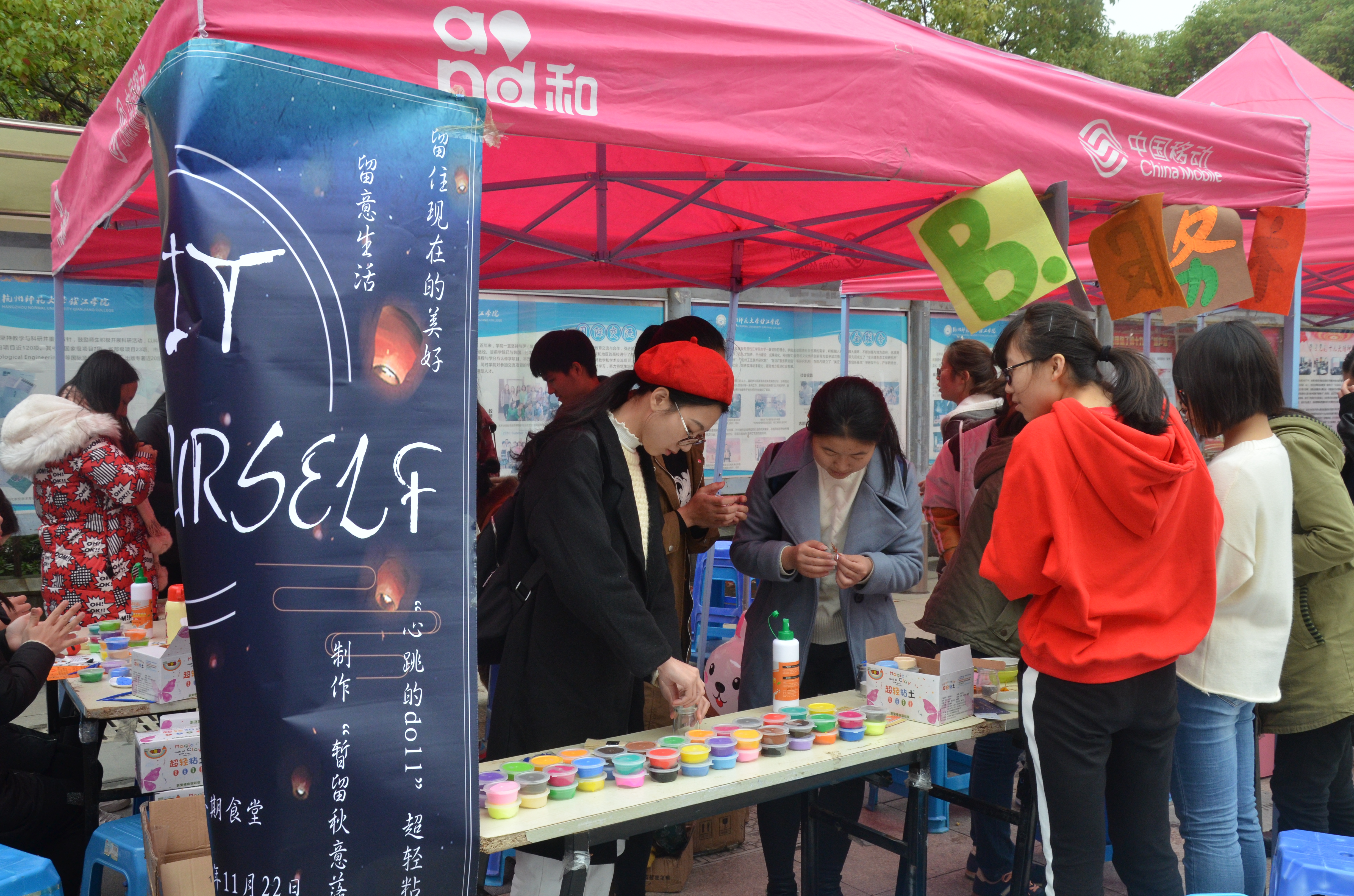 上午十一点活动刚刚开始,场地上就已经热闹非凡,聚集着一群闻讯而来的同学们,他们都想体验一番DIY的乐趣,想亲手制作落叶灯并感受超轻黏土的魅力。现场提供的材料虽然有限但想象力却是无限的,在场的同学们热情地相互讨论着自己的创意点子,被秋风扫起的落叶给了他们无限的灵感,他们有的开始动手捏造属于自己的小制作,将各色的黏土捏造出形状大小不一的球体,再将其粘连在一起组合成各种各样的小玩偶;有的将蜡烛放进玻璃瓶内,在瓶壁上粘上落叶用以点缀,于是红黄绿相间排列着的落叶灯就新鲜出炉了,有银杏叶款的,也有枫叶款的,也有鹅掌楸款的。此时寒意已浓,应景的落叶灯仿佛在为正在逝去的秋天送别,为即将到来的冬天献礼。对于大部分人来说这是异乡的第一个秋天,一盏盏别具特色的落叶灯在留住这份秋意,留住这个与以往不同而又深入心底的秋天,留住这份大自然给予的美好。渐渐地,来来往往的人在这儿驻足停留,并毫不犹豫地加入其中。活动一直持续到下午4点,现场热闹的氛围感染着每一位同学,用超轻黏土塑造出的小玩偶和各式各样的落叶灯相间排列,这一番景象吸引着同学们的目光,在这活动即将结束的时刻,他们依旧热情不减,为活动场地添上了一抹青春的亮色。