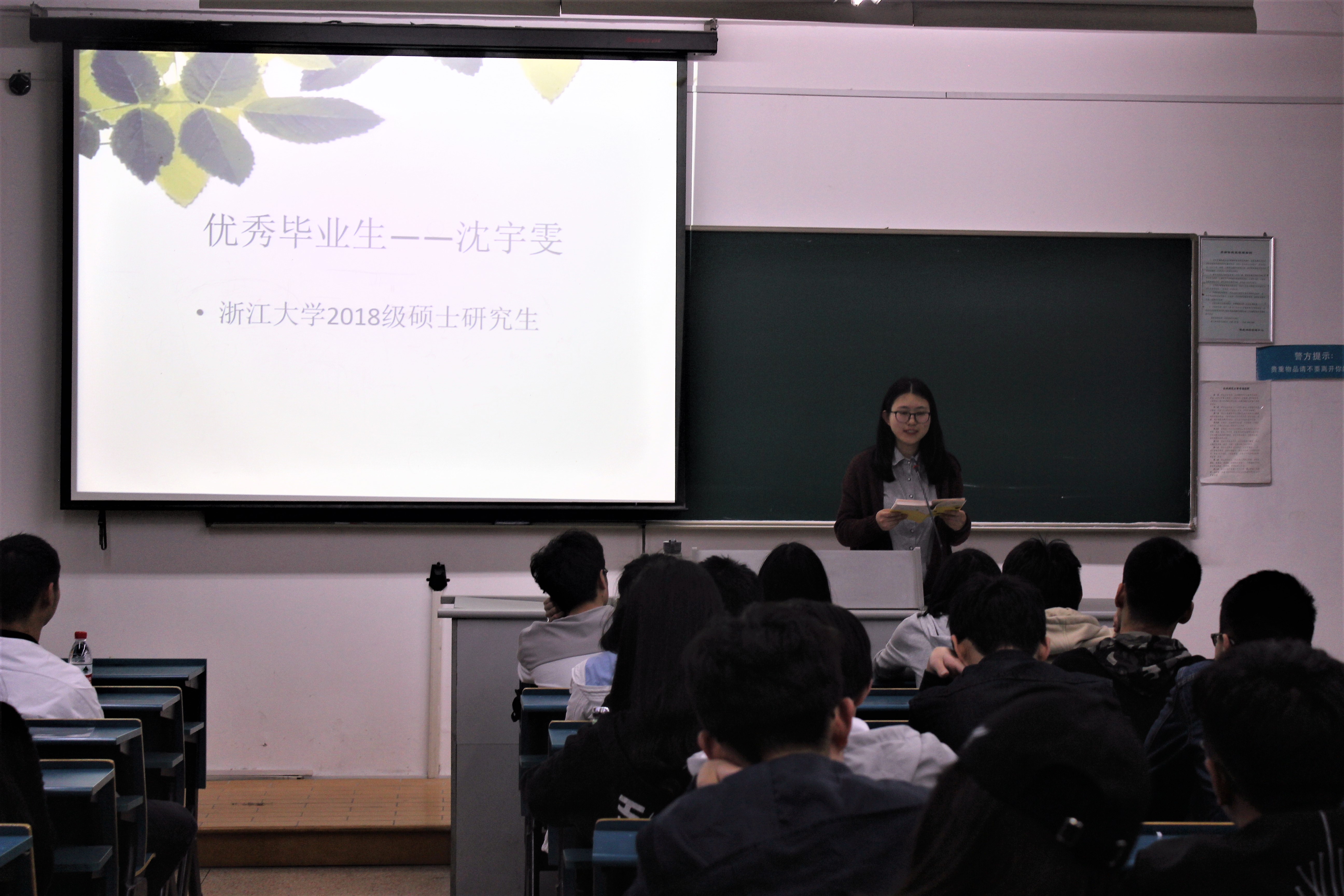 晚上六点半,全场座无虚席,主持人刘璐琦准时开始本次讲座的开场并隆重介绍了所邀请的老师与优秀毕业生们。第一位上台分享考研经验的是浙江大学2018级硕士研究生——沈宇雯,她在校期间成绩优异,获得数次奖学金,如优秀学生一等奖学金、优秀学生二等奖学金、学业优秀二等奖学金等等。她详细的讲述了自己考研时的心路历程。首先前期准备工作要充足,通过各个渠道如学校官网来查阅资料,然后分析数据,将各个高校的研究生名额落实清楚;在中期考试复习方面,她提出要刷大量的真题,看细胞生物学、微生物学、生物学等网络视频;在后期考研成绩出来后,无论上线后的分数高低,都应主动联系导师、广发邮件,为自己取得最佳时机。