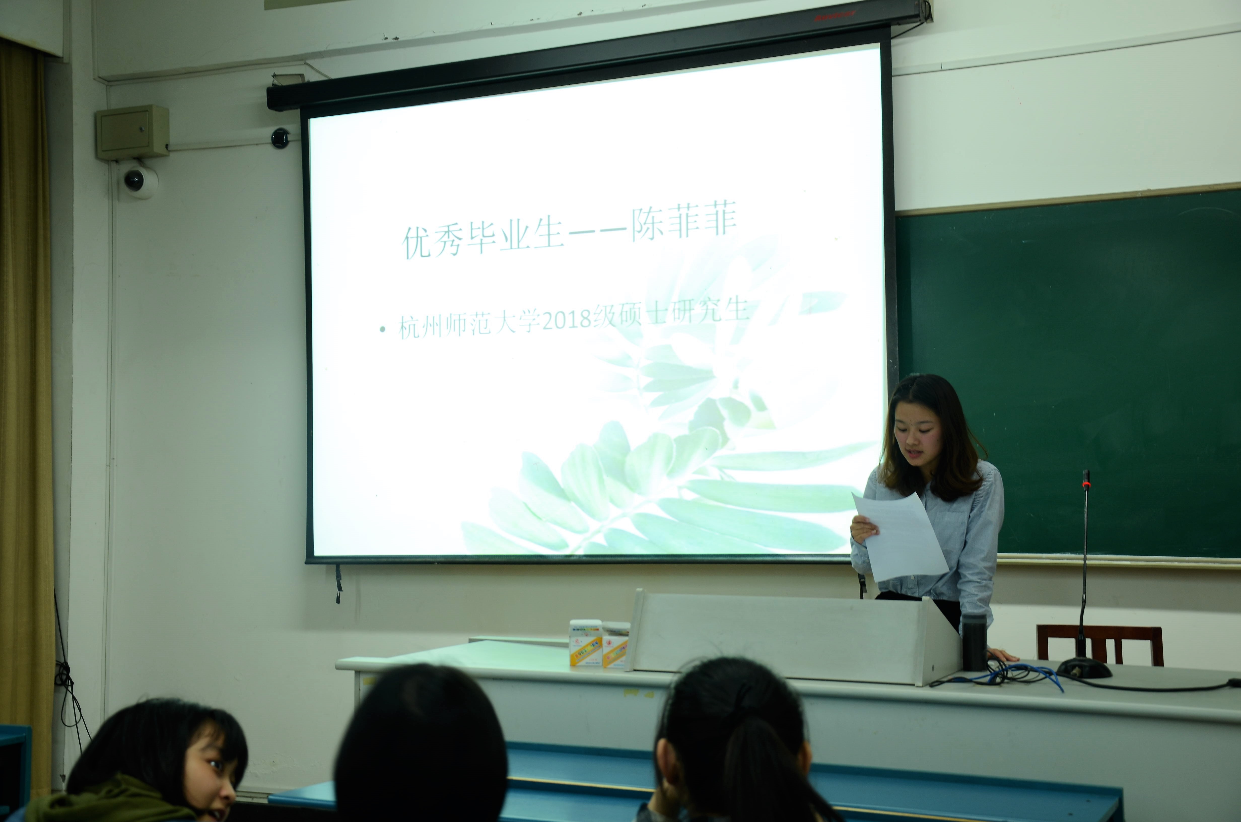 晚上六点半,主持人曲雯迪准时拉开本次讲座的序幕。第一位上台分享考研经验的是陈菲菲学姐,她在校期间成绩优异,2016-2017年连续两学期获得校一等奖学金、2016-2017年获得校“三好学生”称号、2016-2017年获得校优秀干部称号、、2017-2018年第一学期获得省优秀毕业生。她详细的讲述了自己考研时的心路历程。她将考研期间的心得总结为三句话:1、选择比努力更重要,对自己要有明确的判断。2、学习时长代表不了什么,效率才是关键。3、不要把今天的任务留到明天。她还以英语为例,具体分析了该如何有目的性地学习。