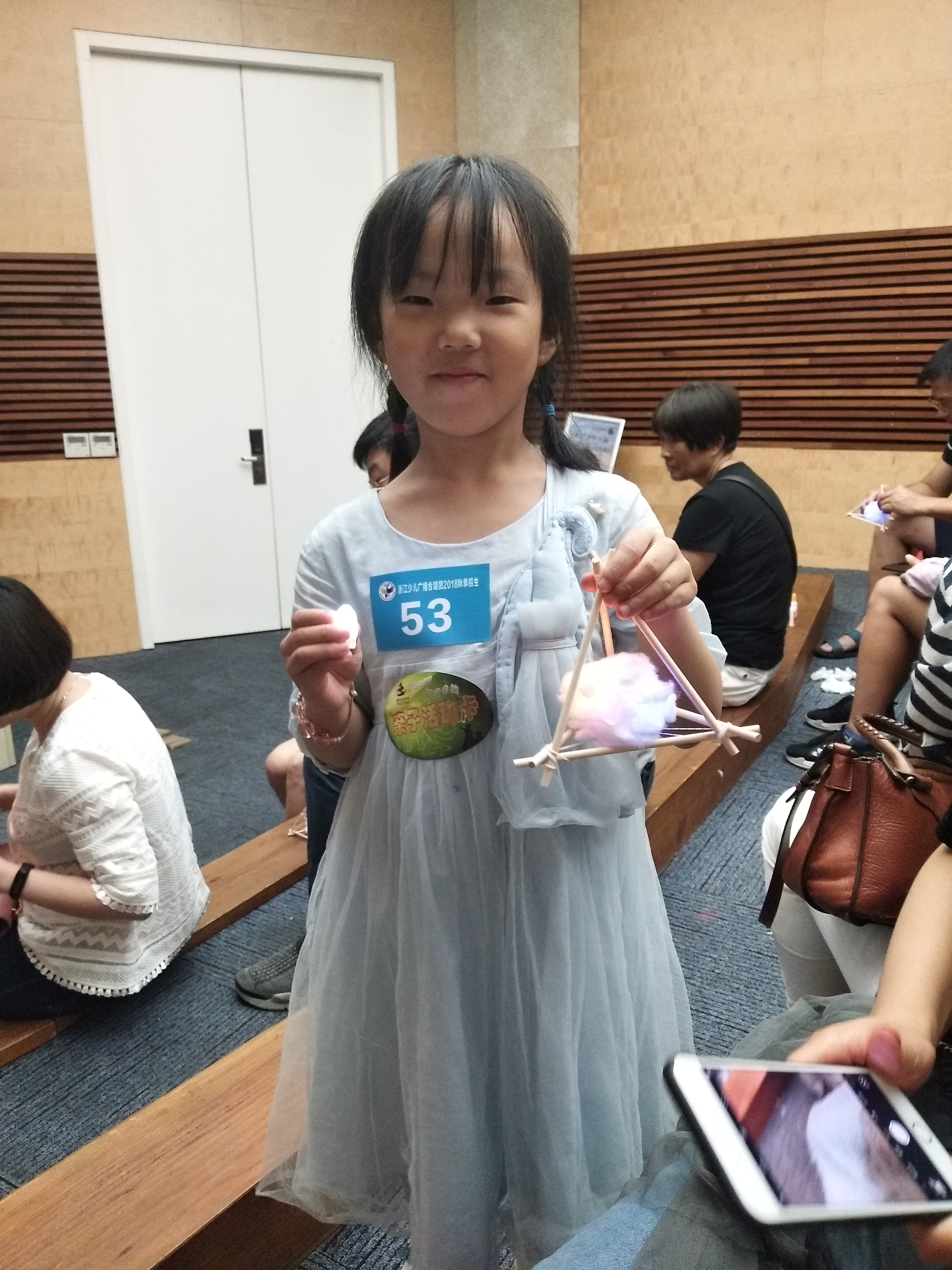 活动开始前,志愿者们通过在自然博物馆一楼发放活动宣传单和一一询问家长,吸引了很多参与者。参与者们在一楼服务台报名后,就被领到四楼的小科普教室,正式开始了此次亲子活动。志愿者先通过一个短小的视频介绍了会吃昆虫的植物,激发了孩子们参与活动的兴趣。之后,志愿者通过向孩子们讲解植物光合作用并且引入地球公转和自转的知识,不仅使孩子们了解白天黑夜交替的原因,并且使孩子们认识到灯在黑夜中的重要作用。紧接着,志愿者又介绍了小夜灯的制作方法:先是将三根木棒用橡皮筋绑成一个等边三角形,再用三根木棒搭成一个三脚架,两个部分组成一个等边四面体,再将棉花撕碎在其中加入小LED灯,用胶水将棉花粘住并粘在等边四面体的底面中心,一个小夜灯便完成了。孩子们兴趣浓厚,跃跃欲试,家长们也对小夜灯的制作产生了兴趣,于是纷纷动起手来。很快,小夜灯就制作好了,孩子们捧着自己制作的小夜灯兴高采烈地离开了活动现场。有家长表示:“希望这样的活动越办越多越办越好。”
