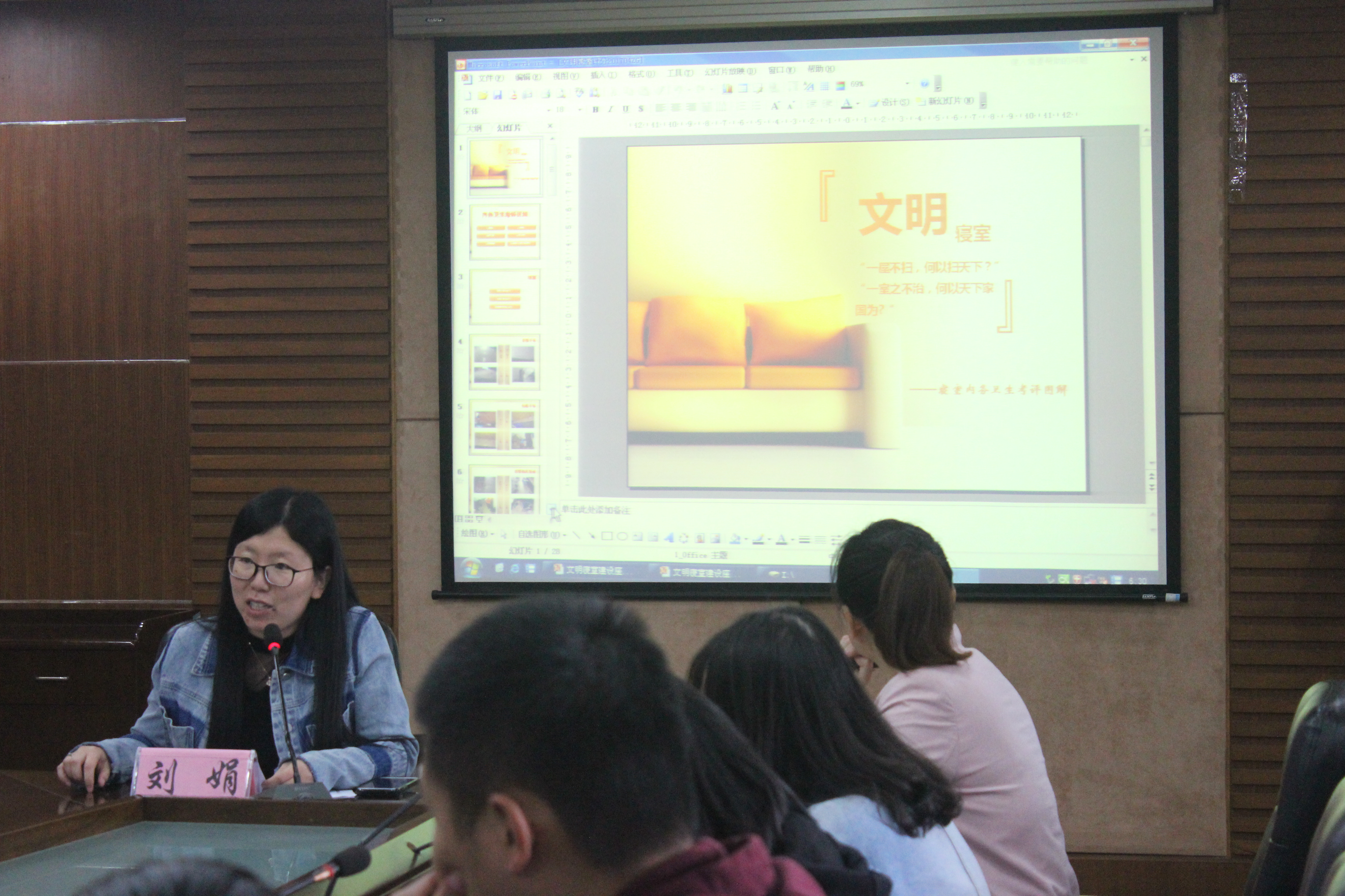 为了迎接即将到来的教学评估,进一步增强大学生的寝室文明和安全意识,努力营造学校良好健康的环境,11月7日,成人小说 于行政楼422室开展了“怎样建设文明寝室”为主题的座谈会。院学工办主任倪雅老师主持会议,公寓生活辅导员刘娟老师主讲。