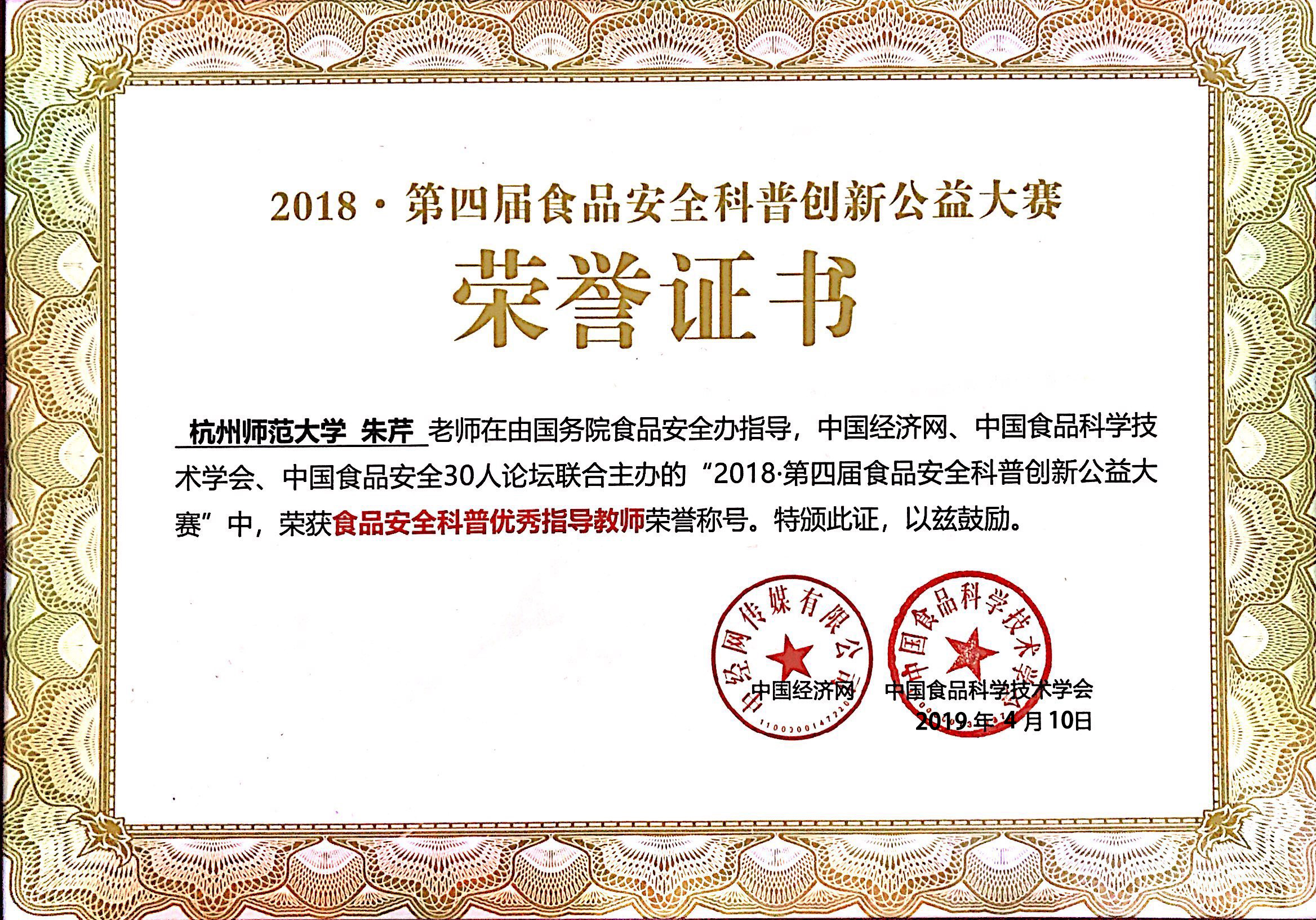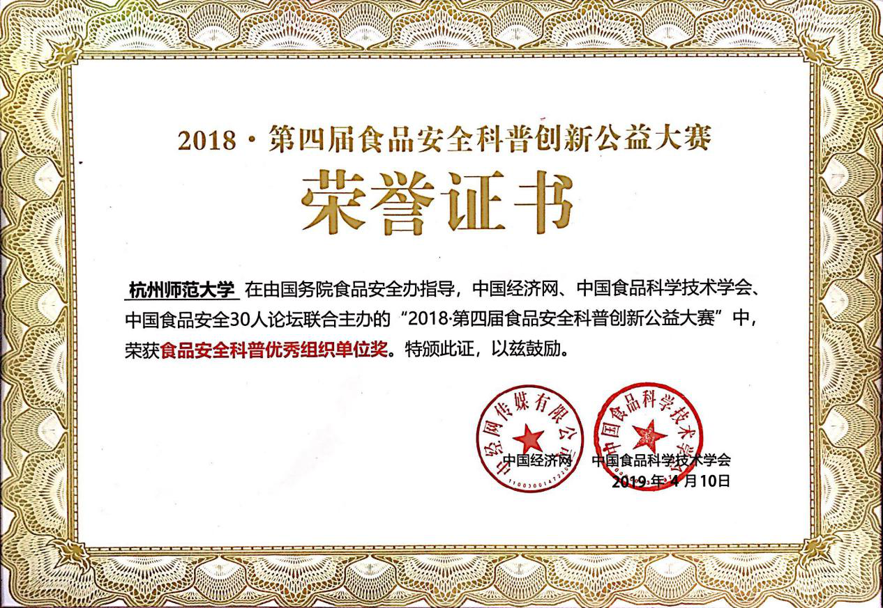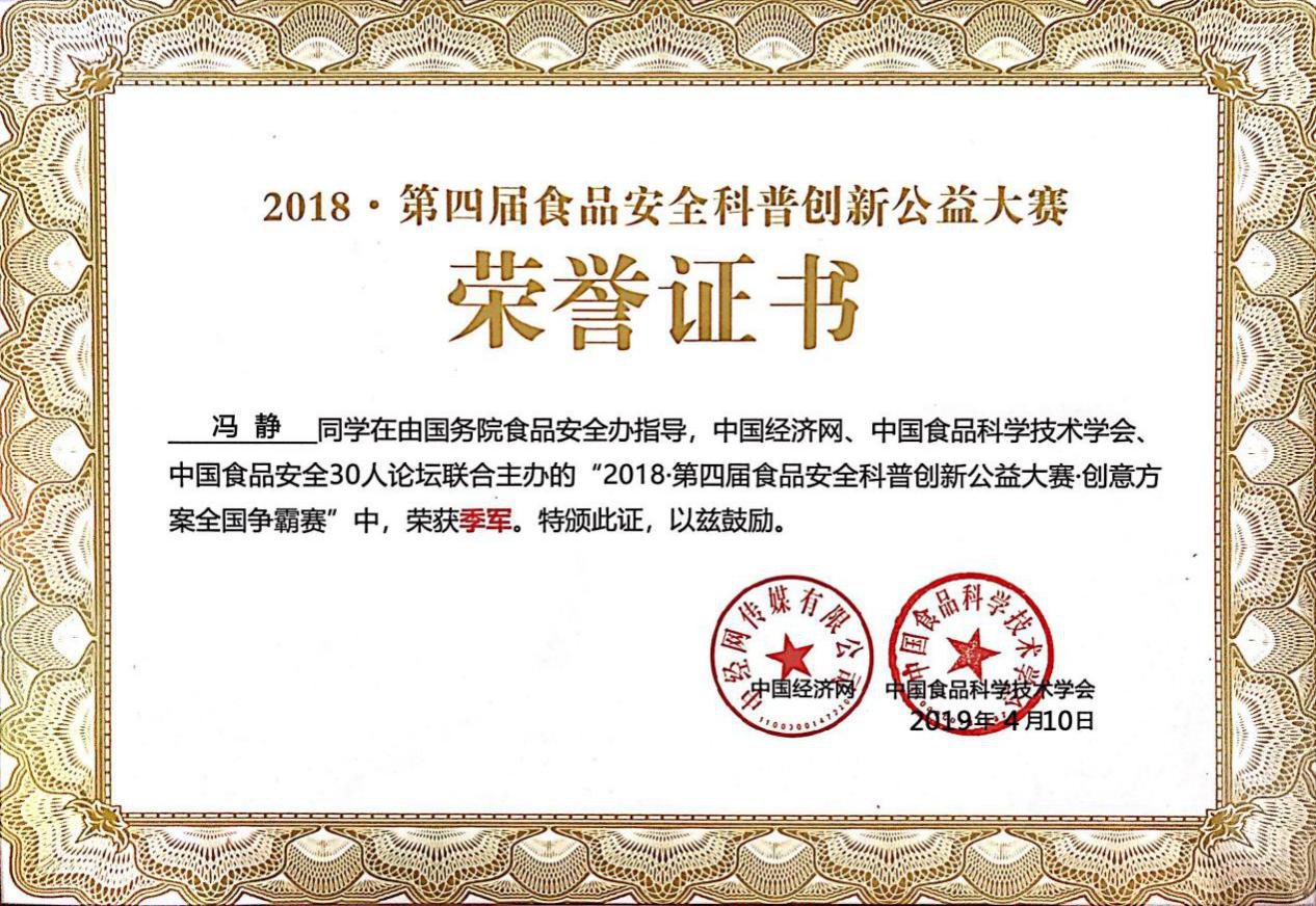 2019年4月10日,第四届食品安全科普创新公益大赛暨高校总动员总结表彰大会在北京经济日报社召开。本届大赛由国务院食品安全办指导,中国经济网、中国食品科学技术学会、中国食品安全30人论坛联合主办,成人小说 承办,康师傅控股有限公司独家支持。成人小说 “求真务食”社团食安171班冯静同学在此次创意方案全国争霸赛中喜获季军。总结大会为成人小说 颁发了年度“食品安全科普优秀组织单位”称号,并为对大赛贡献突出的指导教师朱芹老师颁发了“食品安全科普优秀指导老师”荣誉证书。