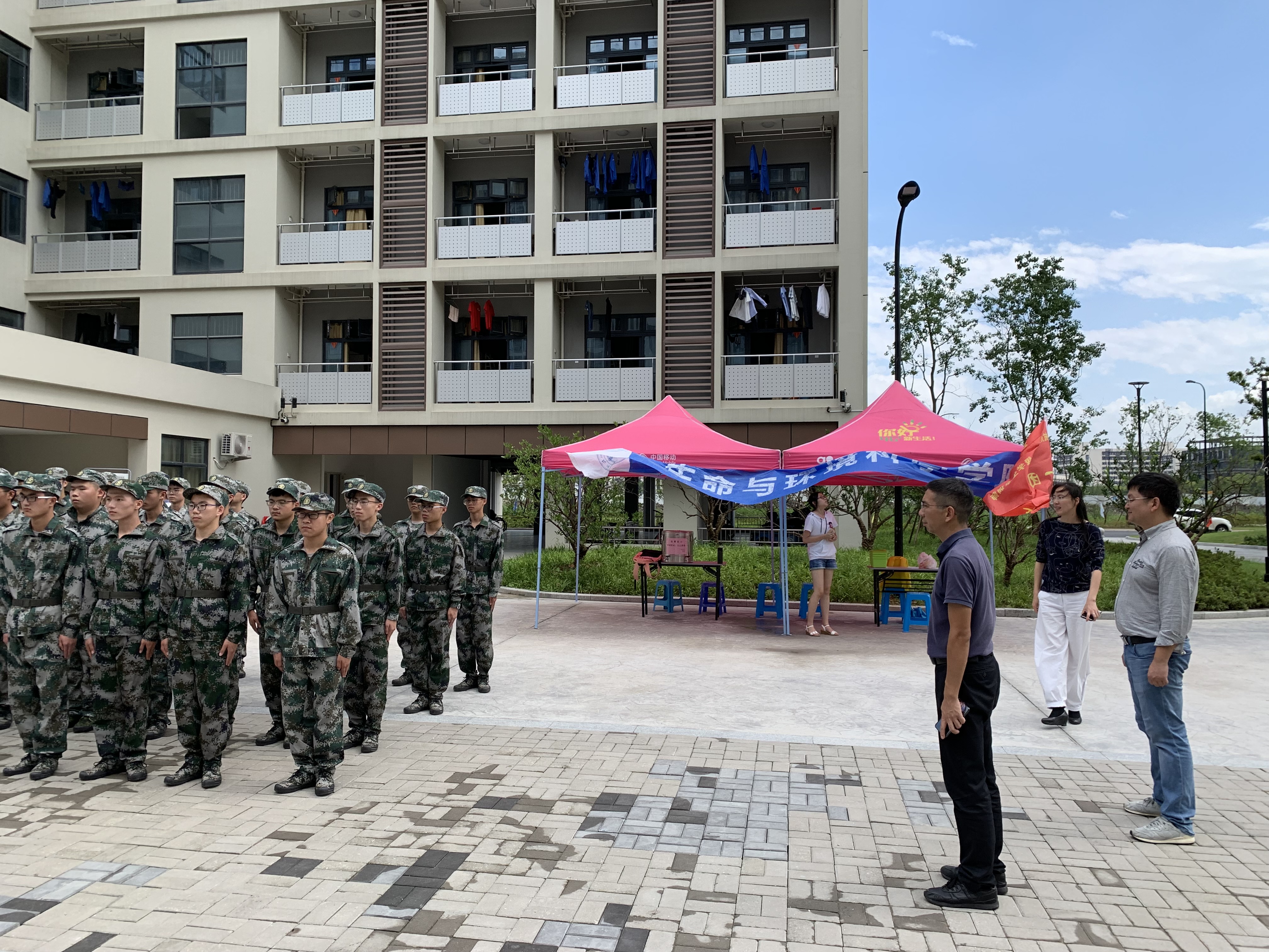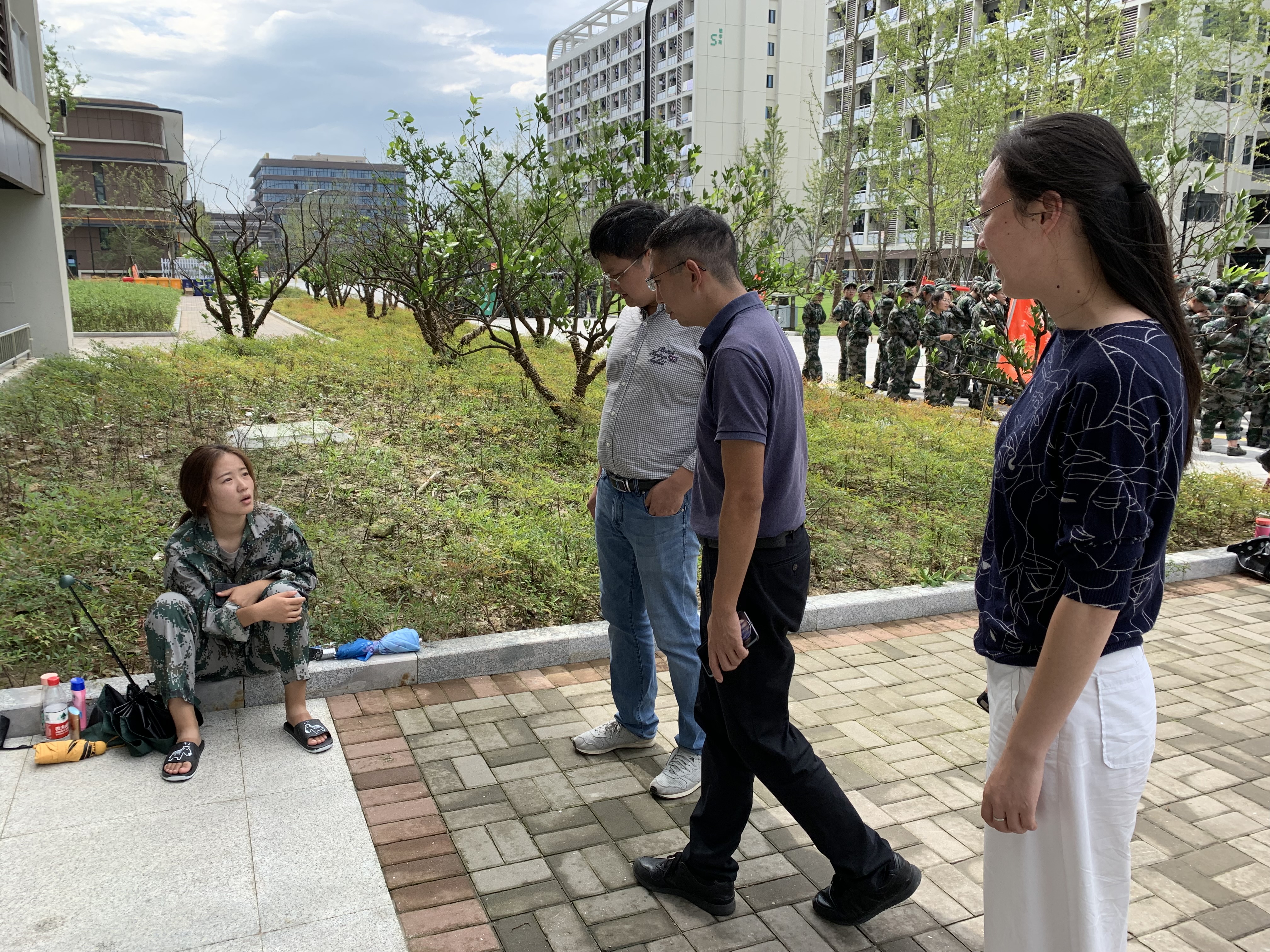2019年9月6日下午,成人小说 党委书记张立明,副院长金仁村、党委副书记余洁、2019级辅导员陈好四人同行,来到2019级新生军训场地,成人小说 仓前校区进学苑看望军训同学。