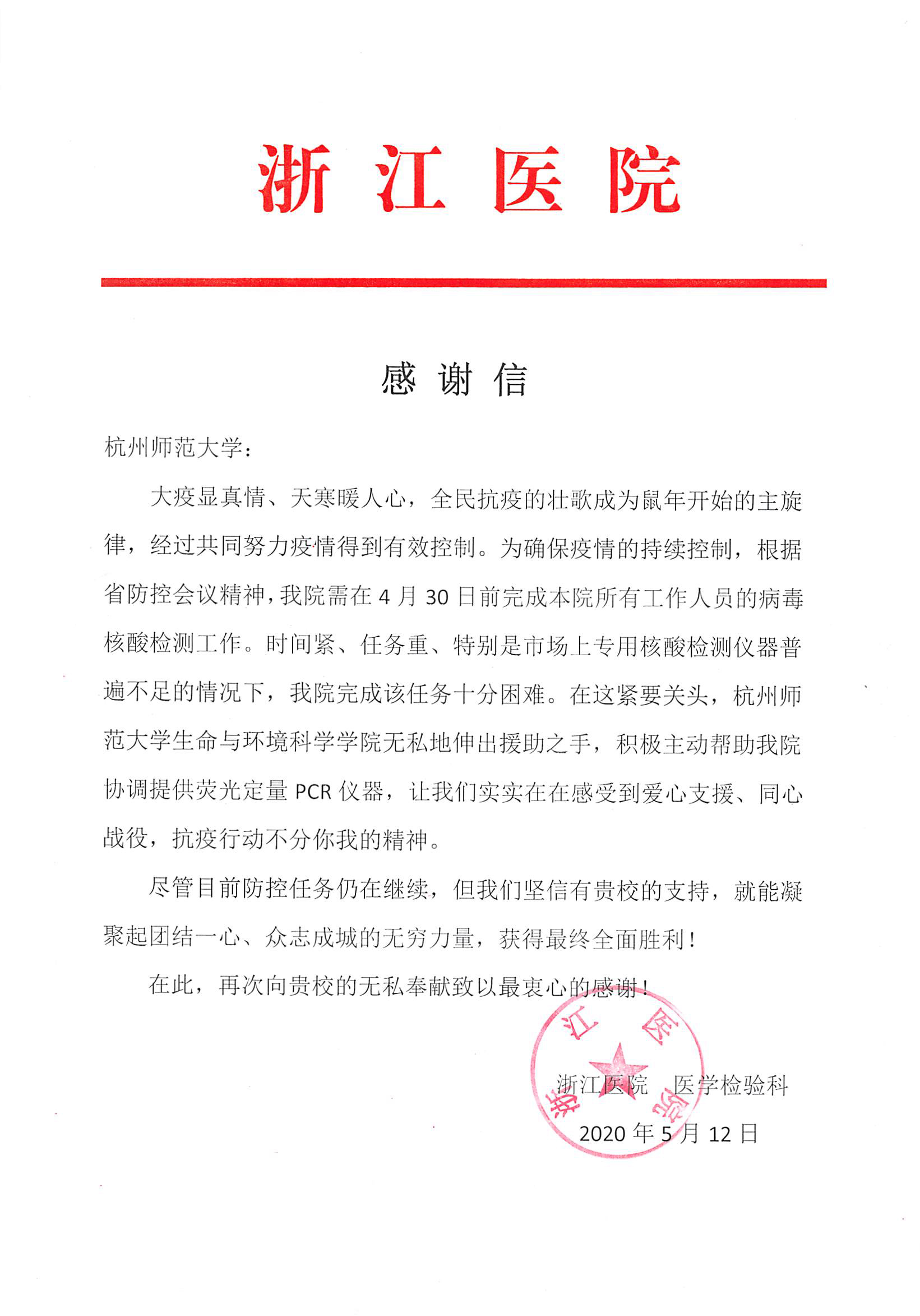 大疫面前见真情 爱心善举暖心田。浙江医院在面临专业检测仪器不足的情况下需在规定时间内完成院内所有工作人员的病毒核酸检测工作,在这紧要关头,成人小说 无私伸出援助之手,积极主动为浙江医院提供荧光定量PCR仪器,并在学院李艳老师的使用仪器指导下让浙江医院顺利完成检测工作。事后,浙江医院特意写了感谢信来表达对我校成人小说 爱心支援的衷心感谢。