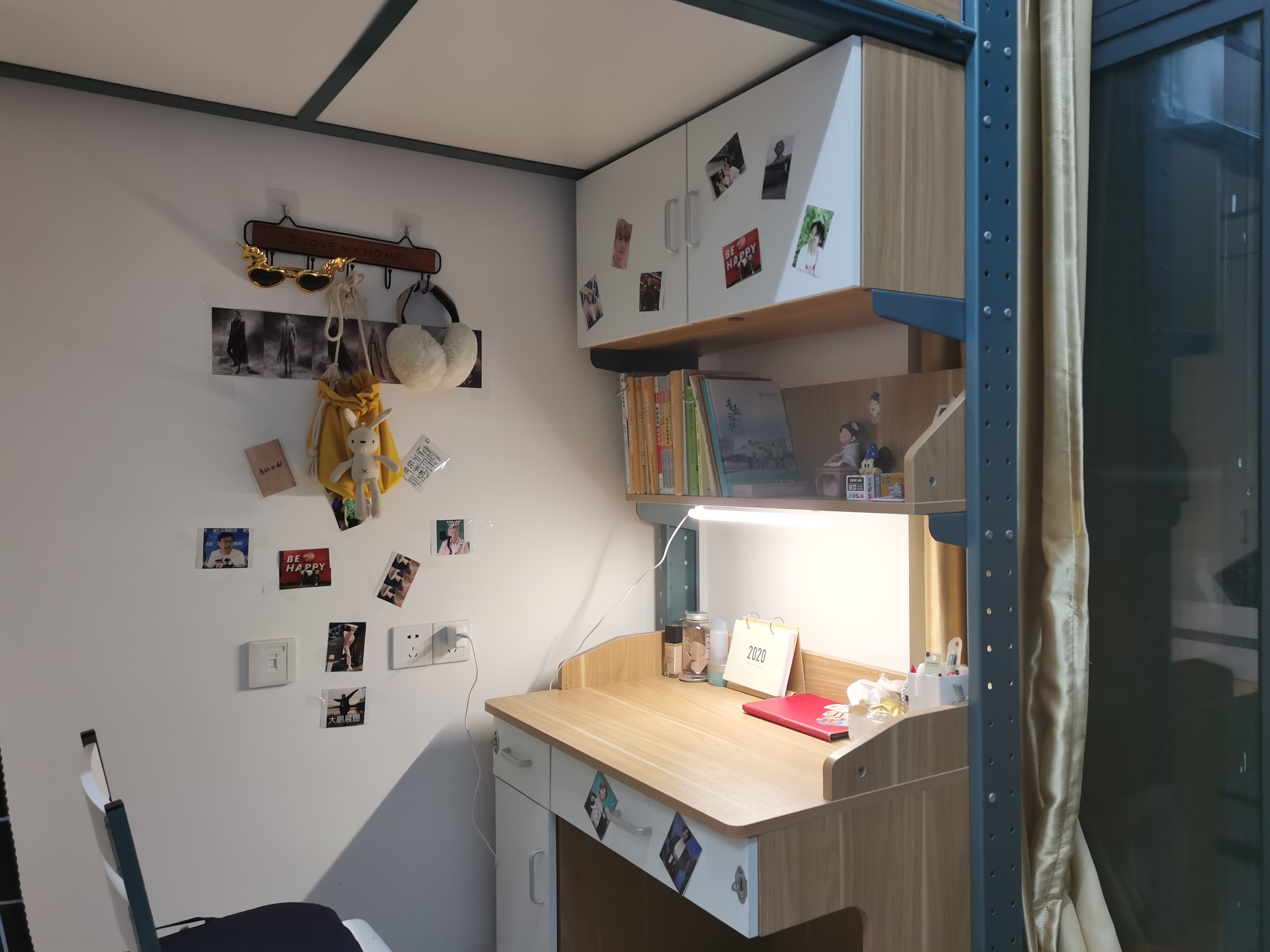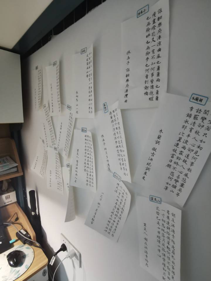 在本次评比当中,涌现出了一批表现优秀的毕业生寝室,这些寝室一尘不染、舒适整洁。其中有8个优秀寝室、5个优秀特色床位和1个优胜特色床位。进学苑4幢204寝室的1号床同时被评为“优秀特色床位”和“优胜特色床位”。该床位的墙面上粘贴的手写诗句,展现了一个理科生少见的文艺气息,不管是学习还是休息,都给人以宁静致远之感。
