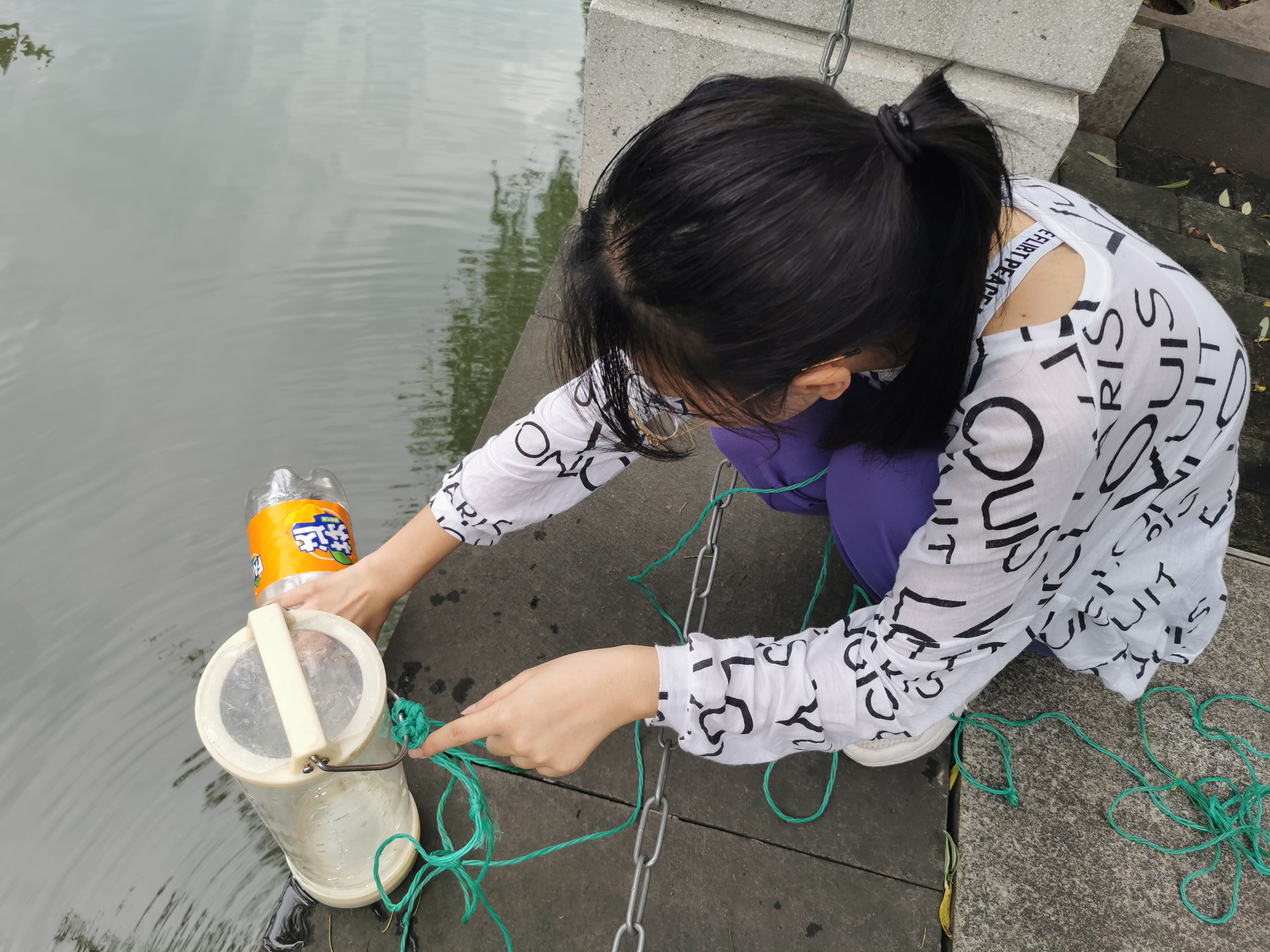 在这些准备工作都完成之后,水质检测小分队的成员们真正开始进行水样采集。由于收集水样的仪器为玻璃材质的,因此为防止实验仪器损坏,大家在使用仪器时都是小心翼翼地,慢慢地把水样收集仪器放入水中,然后非常小心地把水样收集仪器从水中提上来。在水样收集时,同一个组的两位同学互相配合。顺利地把收集到的水样装入塑料瓶中,完成水样的收集工作。