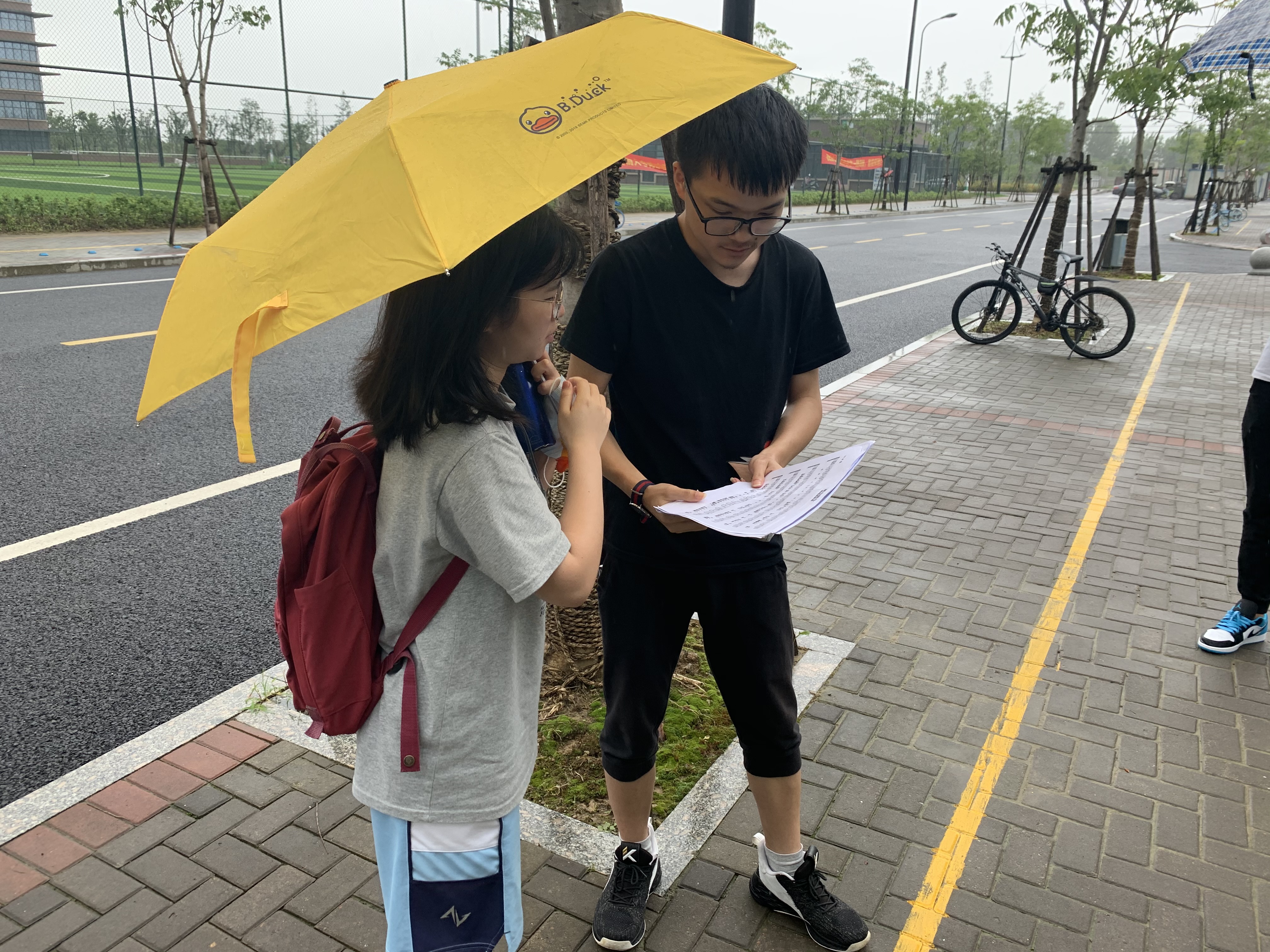天空有些小雨,但这并没有打击实践小组成员的积极性,每个人依然是热情满满,全身心的投入到问卷调查之中。今天的活动主要在c区展开。下午两点,雨势转小,首先由组长带领6个组员分别在寝室楼下、餐厅门口和慎园1号楼开始对来往的同学进行问卷调查。这次的主要问题是疫情对同学生活的影响在什么方面?如果你回家之后是否会参加家乡的疫情工作?如果会,那你会做什么?因为天在下着小雨,所以来往的同学并不多。在被调查的同学中,绝大多数同学表示在出行方面受到的影响最大,由于疫情的到来,是我们不得不待在家中或学校里,不能像过去一样常常出去玩或做其他事情。这使大多数学生都感觉有一种被囚禁的感觉,因为只能待在学校中就不时感觉生活枯燥无聊。在第二个问题中,只有少部分的同学表示可能会参加社区的疫情防疫工作,可能是国内疫情控制的比较良好,并不需要大量的志愿者或工作人员对过往人群进行人员管控,因此也使大多是同学表示在暑假参加防疫工作并没有太大的意义与价值。另一些的同学说,他们会参加社区的工作,以获取志愿者时数,并测量来往人员的体温和检查其绿码为主要工作。