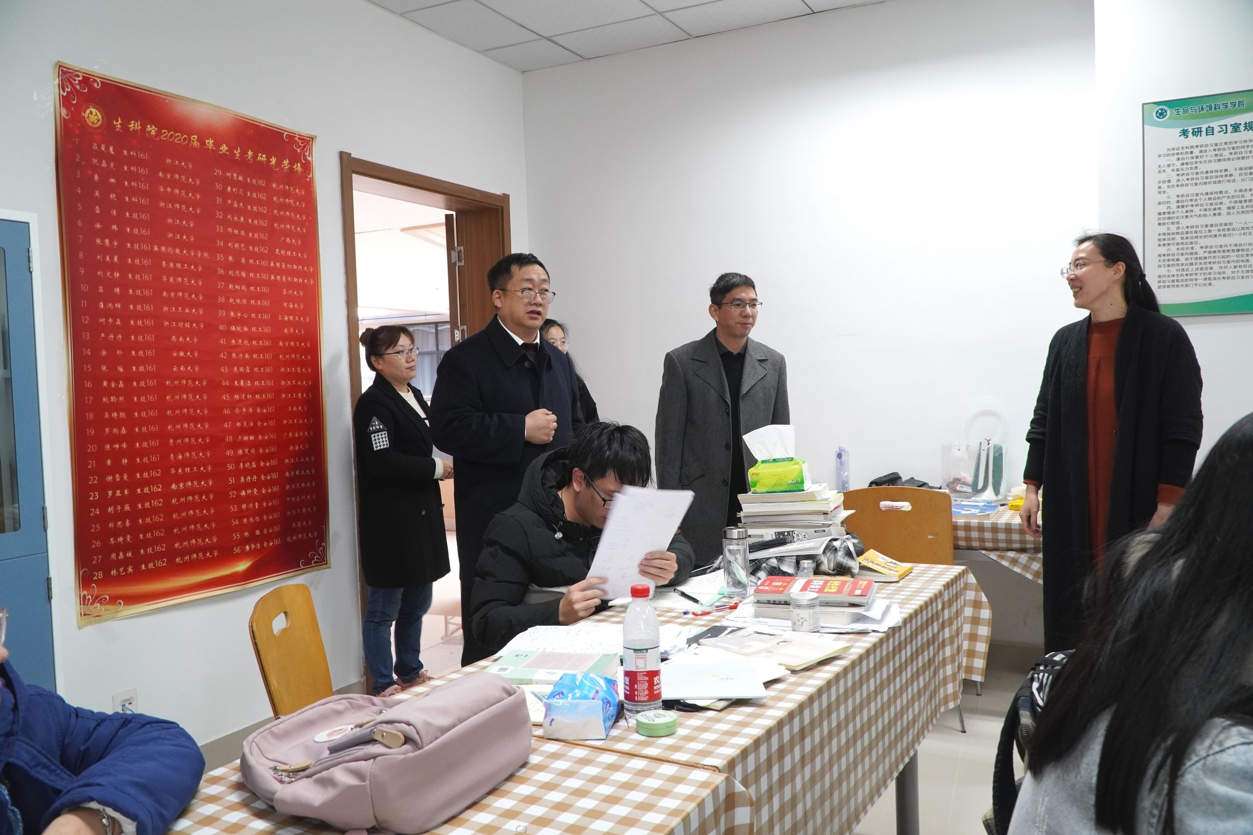 为了坚定考研学子的信念,增强考研信心,缓解备考压力,早晨10点,成人小说 执行院长张杭君、党委书记张立明、副院长于彦春、党委副书记余洁以及学工办主任倪雅走访考研自修室慰问考研学子,为考研学子送上冬日的温暖。