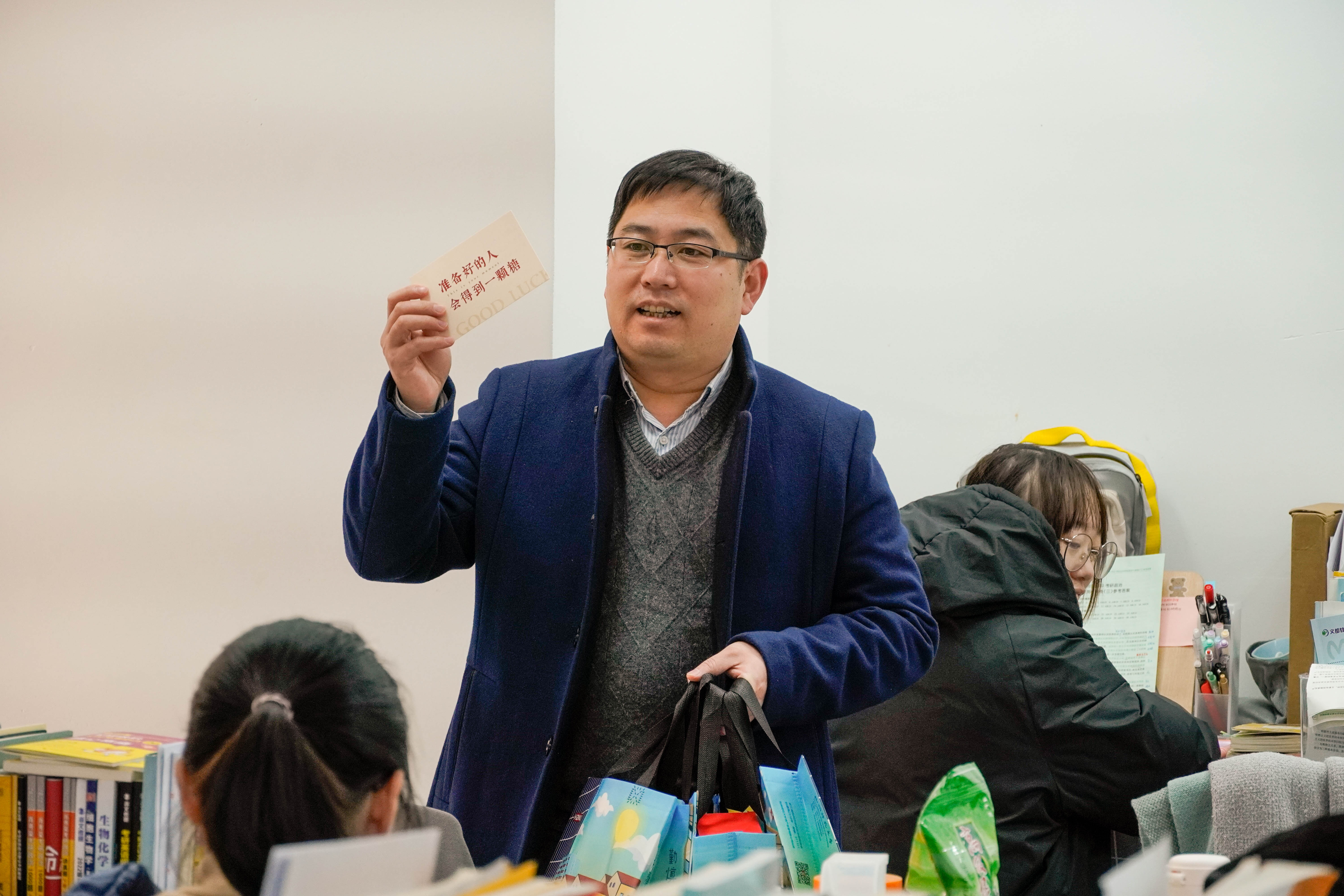 活动中,学院领导们还为同学们送上了精心准备的考研助力礼包,以此表示学院对其的衷心祝愿和殷切期盼。礼包里有保温杯帮助学生驱散寒冷,不仅温暖了考研学子的身体,也给他们带去了源源不断的力量。礼包中还有学弟学妹们亲自写下的祝福,一字一句都是对考研学长学姐们的鼓励与祝愿。