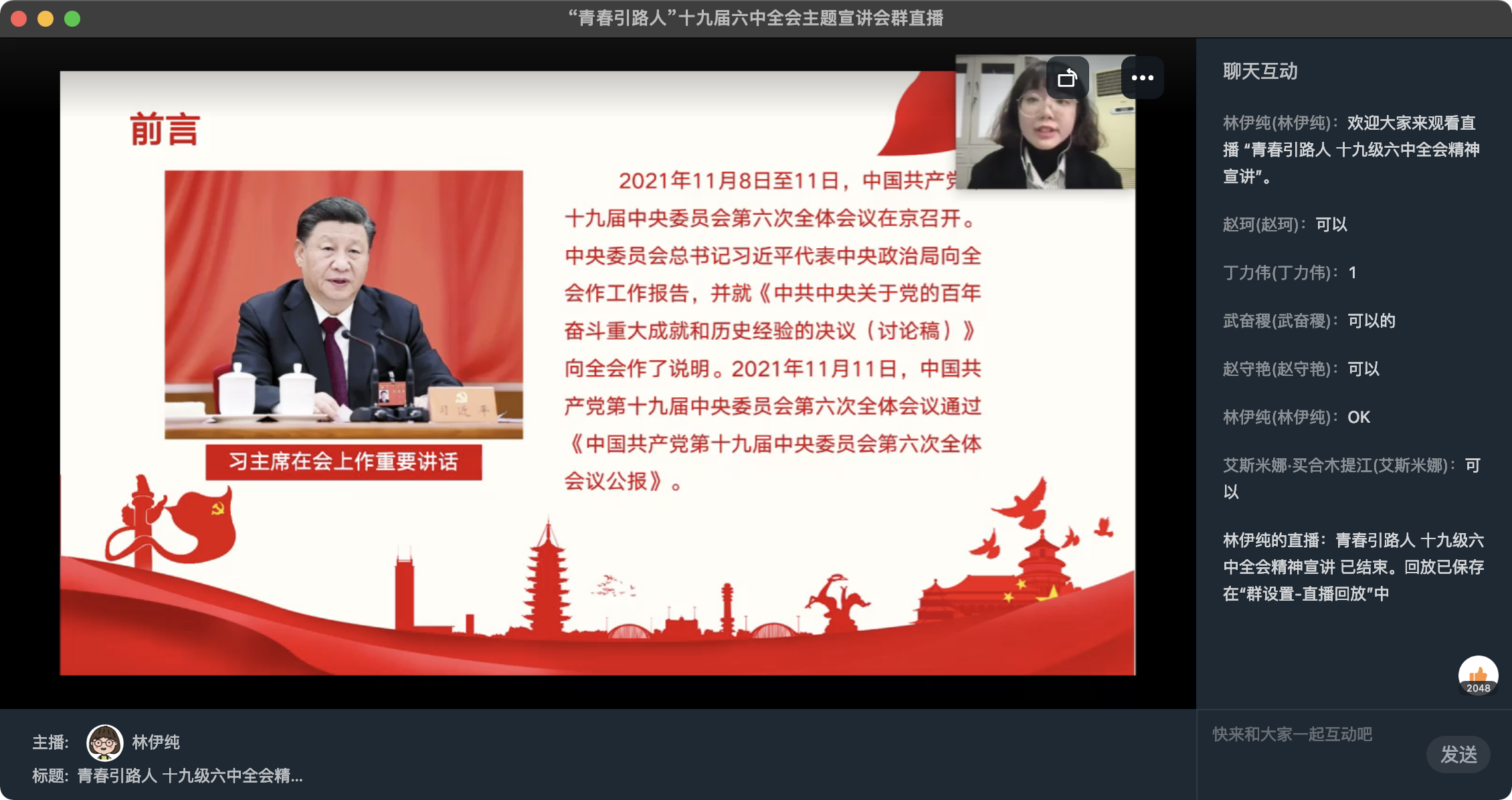 首先林伊纯老师对党的十九届六中全会进行了概况讲述引出本次宣讲会的背景和目的接着林老师介绍了十九届六中全会的历史意义以及回溯百年党史的四个分期党的“十三项”重要成就和十大宝贵历史经验最后林老师勉励所有同学要找准自身定位做时代的服务者