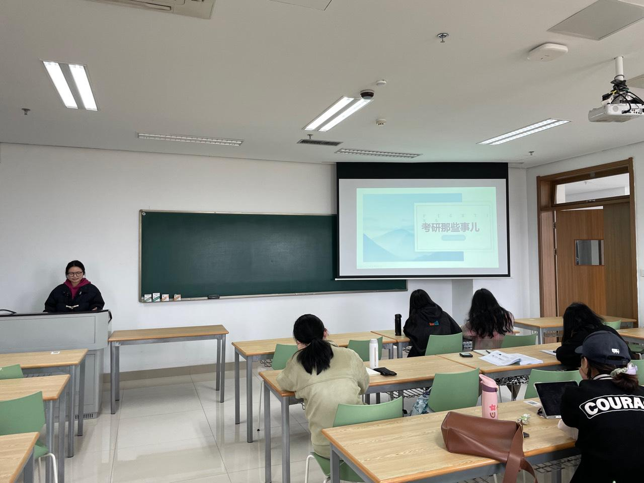 第二环节,班长首先将考研、考公时间细分为准备阶段、基础阶段、提高阶段、强化阶段和冲刺临考阶段,详细介绍了各个阶段重难点和学习心态,以及政治英语和专业课应该如何提高;接着为同学们推荐资料、分享时间安排和实用公众号,给同学们提供了许多网站,能自主检索有用的考研信息,解决了不少现有考研目标同学的燃眉之急;除此之外,以往届考研上岸的学姐学长为例,就如何择校选专业,如何准备研究生各阶段考试,如何安排学习时间等方面提出了很多中肯的建议。