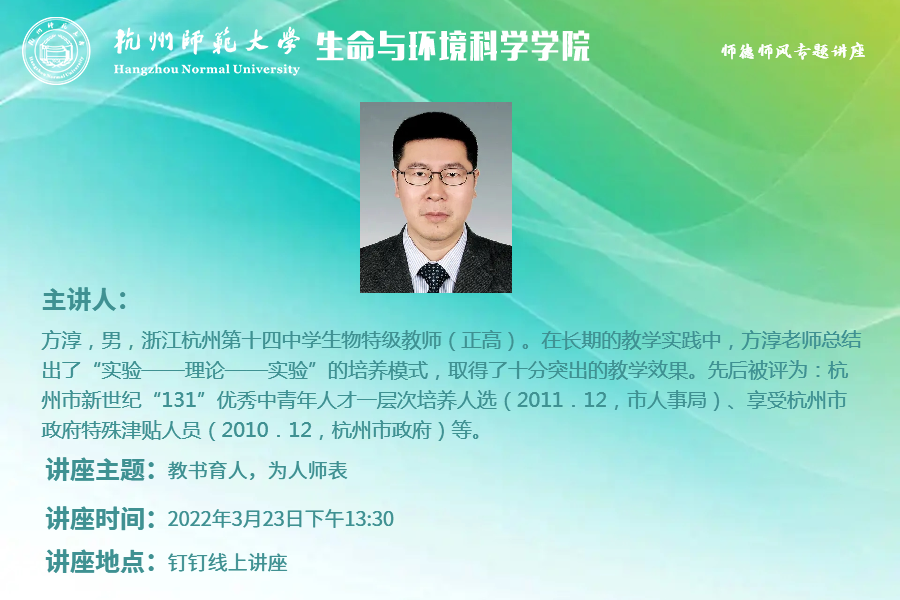 2022年3月23日,成人小说 邀请了十四中的优秀教师代表方淳老师进行以“教书育人,为人师表”为主题的师范生师德师风线上钉钉讲座,参加此次讲座的有副院长金仁村老师、生科师范专业任课教师任山章老师、教学科曹潇月老师,以及2019级、2020级生物科学(师范)班的全体同学。