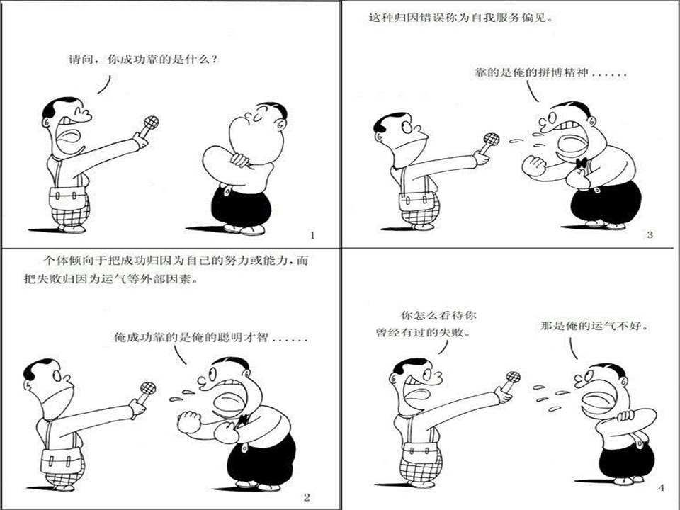 2.错误归因:人的本能反应往往造成错误归因,自我服务偏差不自觉把好的成功归于自己,把失败归于外界。所以辩证分析换位思考,对于正确归因非常重要,特别是自我是主要因素时更是如此。
