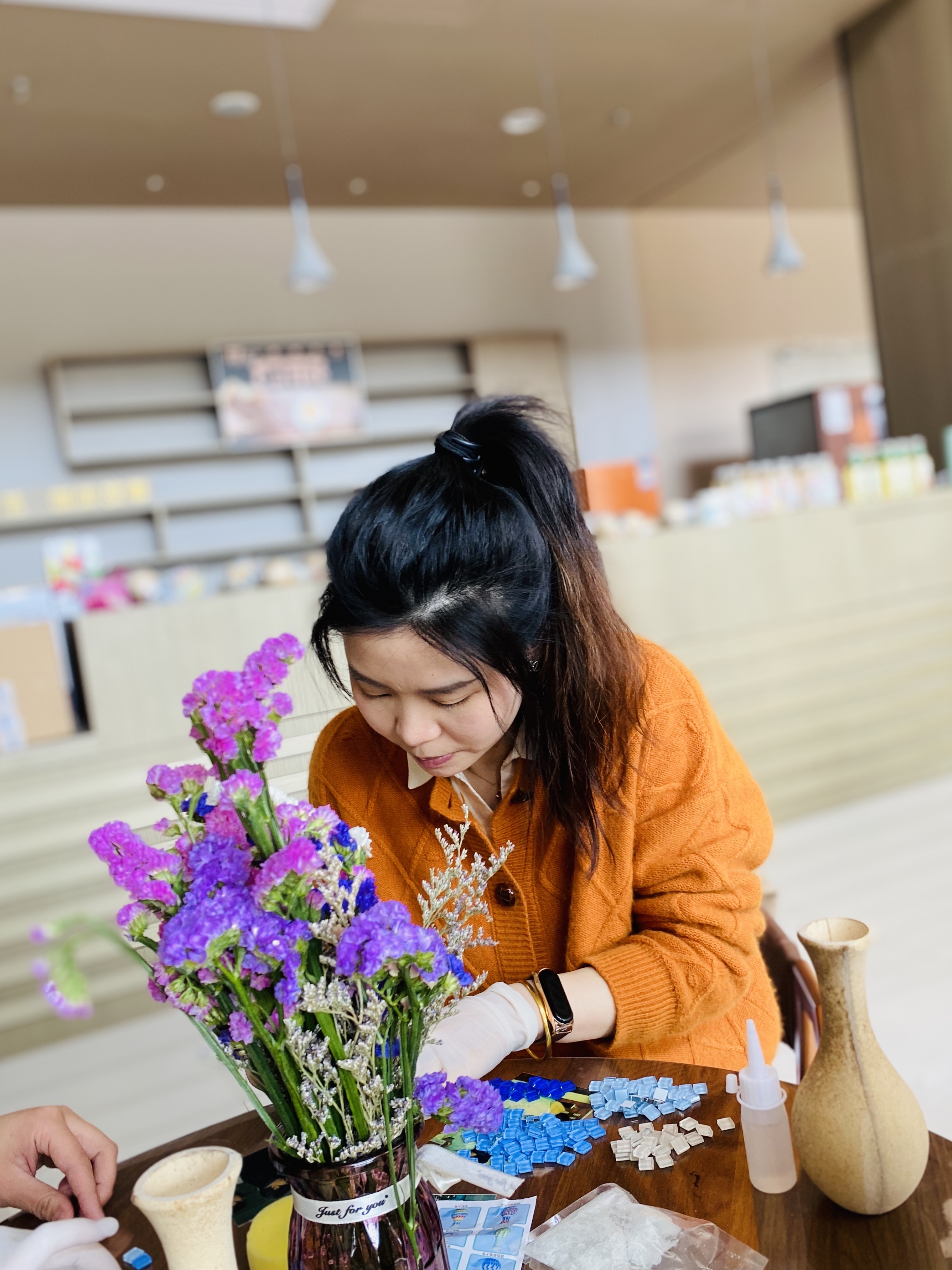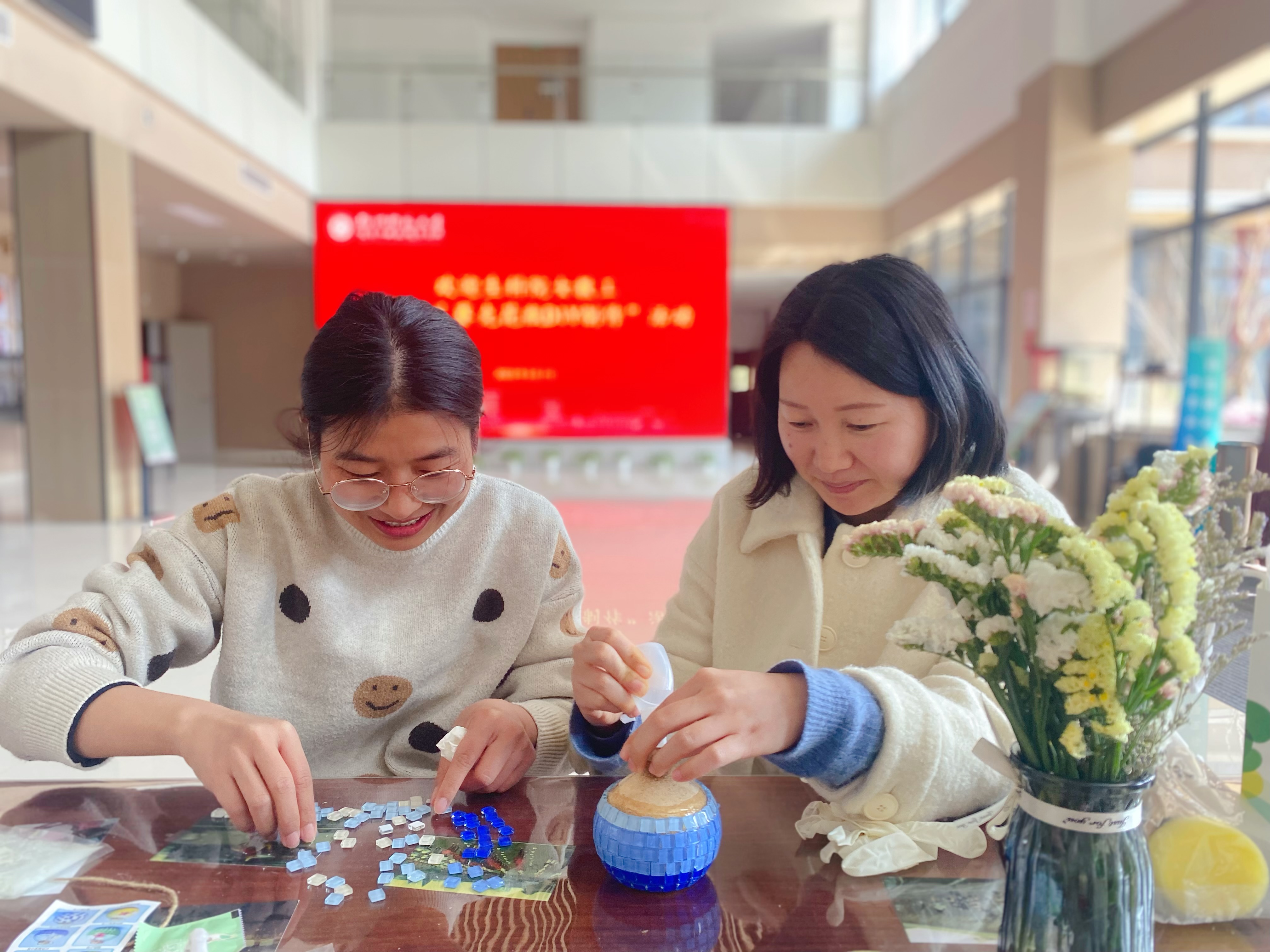 活动期间,女教师们齐聚在慎园15号楼一楼大厅,领取制作马赛克花瓶的原料,如马赛克片等。互相交流后,心灵手巧的女教师们很快掌握了技巧并动手镶嵌起来,搭配干花花束,巧妙地使DIY花瓶成为最炫的艺术品。