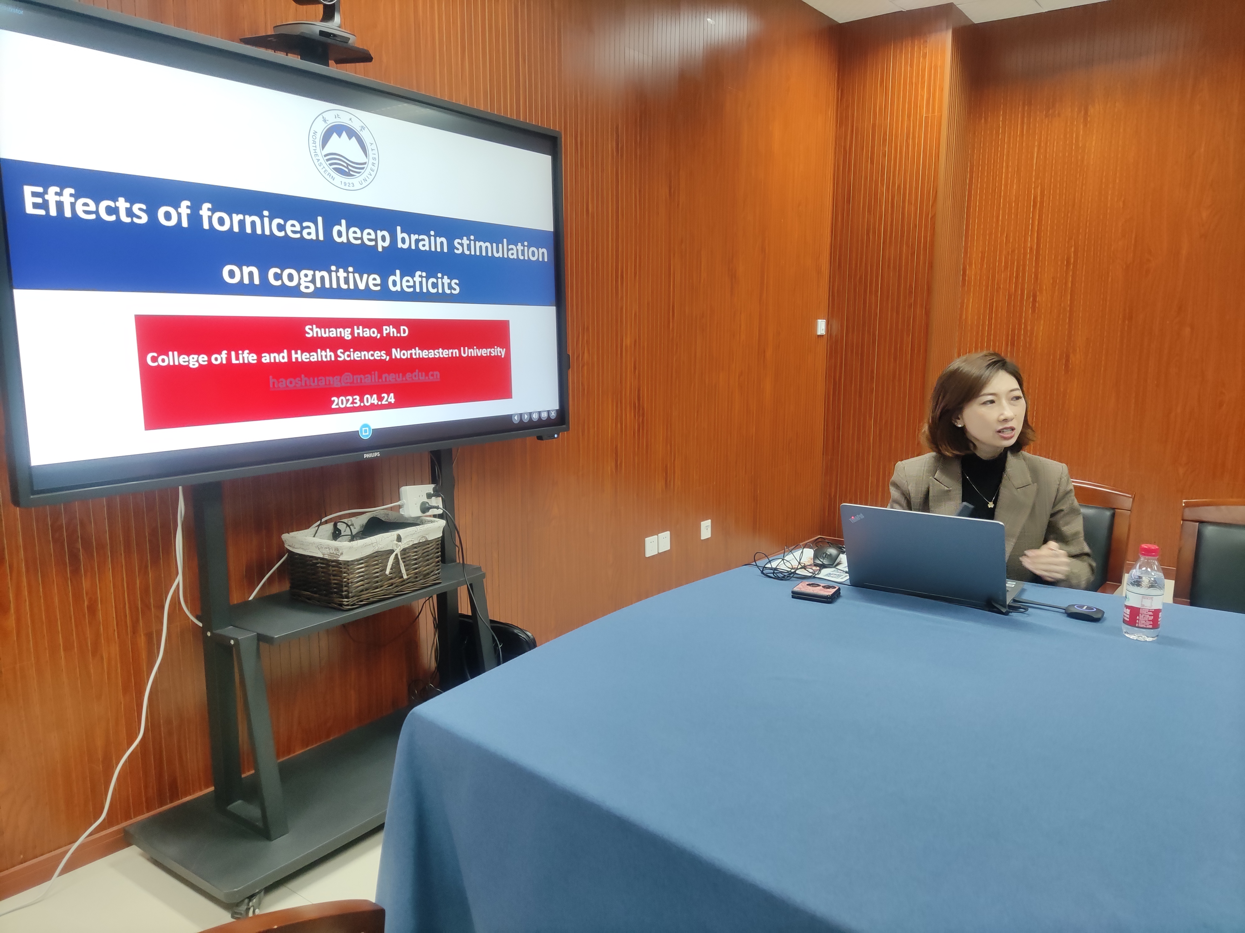 4月24日下午,成人小说 在慎园15-313会议室举行了2023年第14期生科撷英讲坛,东北大学“海外百人”青年特聘教授,国家级青年人才项目入选者,辽宁省“兴辽英才计划”青年拔尖人才郝爽教授,应邀来成人小说 为师生们做了题为“Effects of forniceal deep brain stimulation on cognitive deficits”的学术报告。讲座前,薛大伟院长和张立明书记与郝爽教授进行了座谈会,随后薛大伟院长主持了论坛,神经发育生物学方向老师和研究生积极参加。