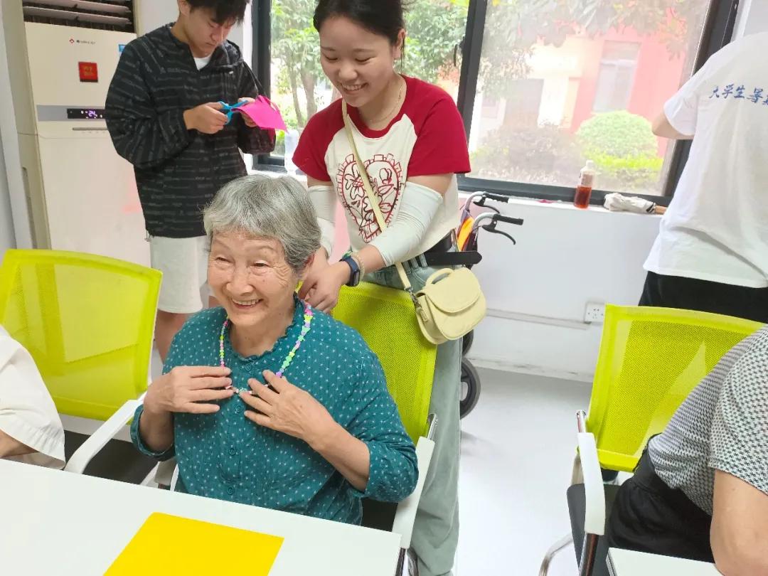 我帮助的是一位串珠串的李奶奶,在聊天过程中,我渐渐了解到她年轻时候正是一个走南闯北的“探险家”。第一条项链完成后,由于绳子的结没有系紧,各色的小珠子撒满了一地,发生了手工制作中不怎么愉快的小插曲,不过在我的安抚下,我们又开始重新制作新一条珠串啦!最终作品完成时,奶奶兴奋地向同伴和护工们展示脖子上的“战利品”,强烈要求院长给我和她多多合影。