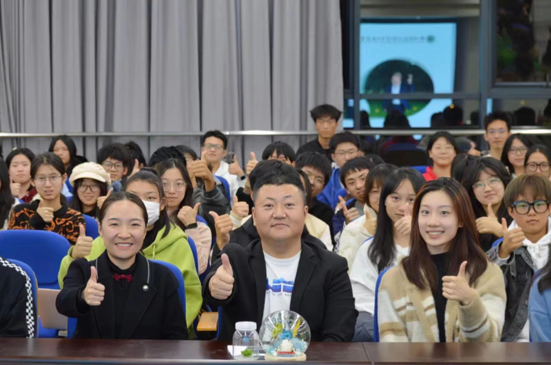 讲座后,学生代表为忻皓送上精心准备的“永生花”摆件和组培生态瓶纪念品。现场同学们也争先和忻皓合影留念。