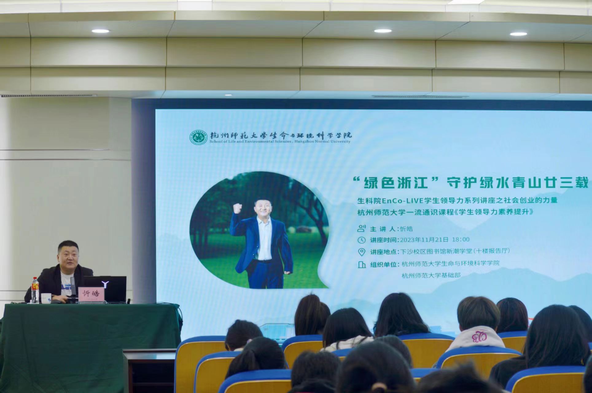 11月21日晚,成人小说 、基础部、公共管理学院联合举办EnCo-LIVE学生领导力系列讲座之社会创业的力量。浙江省科普联合会秘书长、“绿色浙江”联合创始人,社会创业者,生态文明理念传播者忻皓于下沙校区图书馆新潮学堂作“绿色浙江守护绿水青山甘三载”主题讲座。