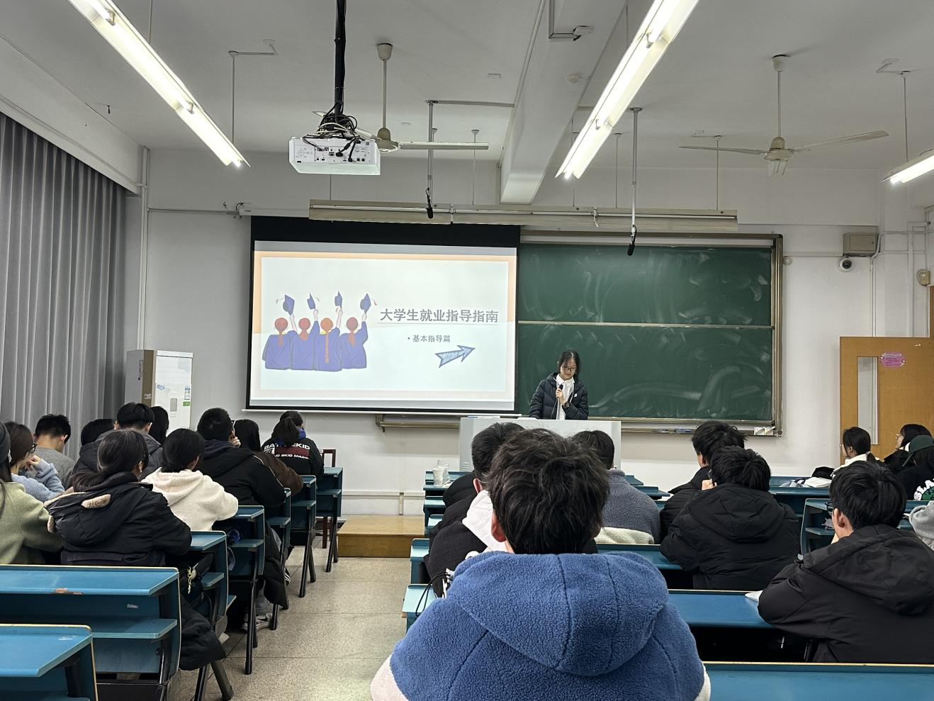 在活动的开始,黄昕同学便向大家提出了问题:我想做什么?是出国,是考研,还是考公,支教?未来我能做什么?当前的就业形式与政策我们真的了解吗?这一系列问题不禁引发了同学们的思考,当今的专业学习是为了未来就业铺垫基石。