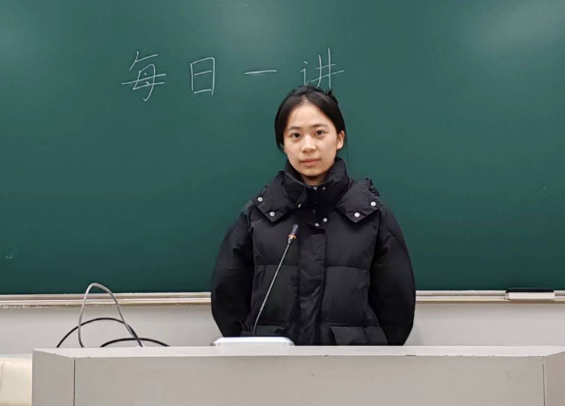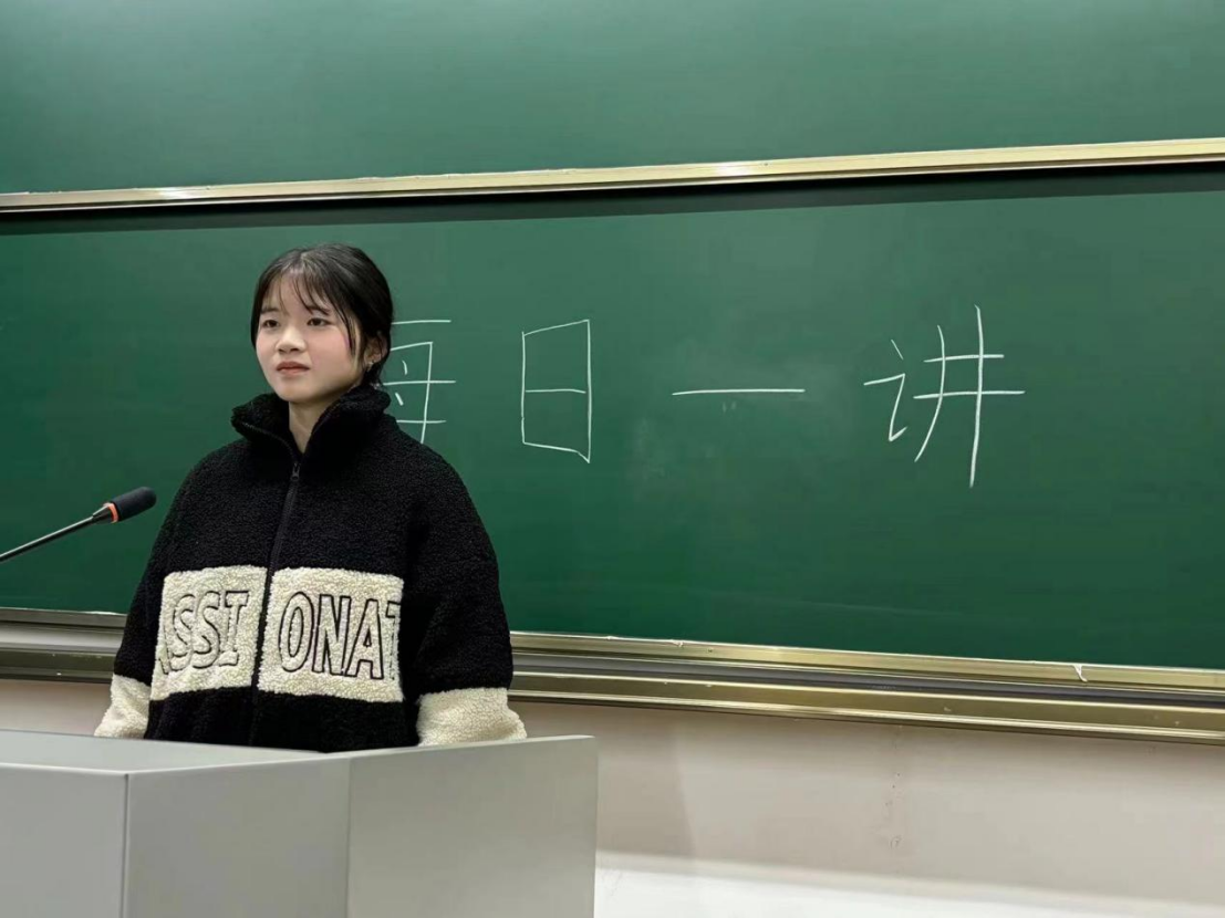 2023年12月28日,在成人小说 仓前校区慎园2号楼教室中,吕兰心同学在课前向同学们做以“延续红色基因,厚植爱国情怀”为主题的每日一讲活动。
