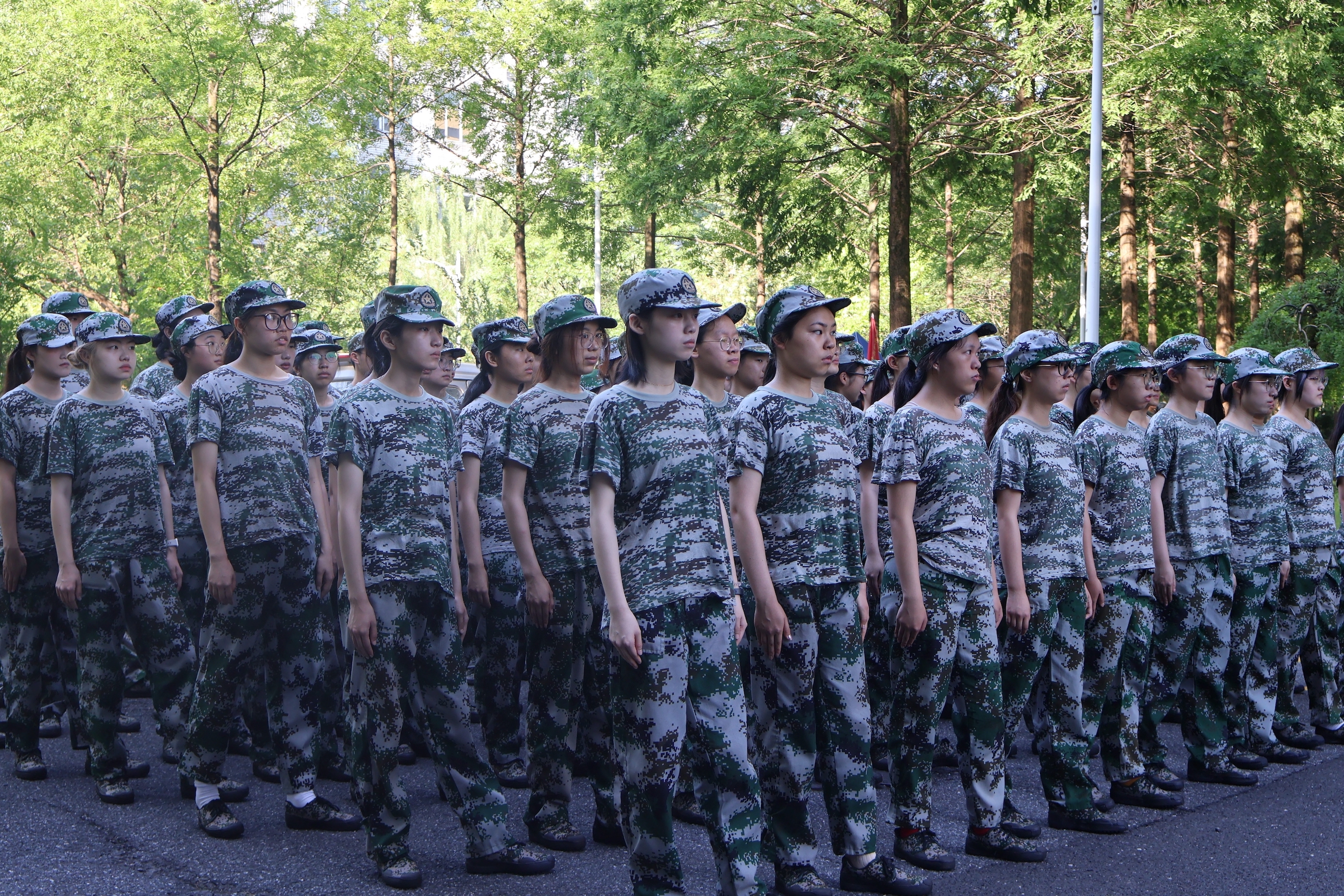 今天是军训的第五天,在接近40度的高温下,太阳仿佛是一位无情的炼金术士,将整个世界置于其火热的熔炉之中。阳光火辣辣的,如同无数金色的箭矢,无情地射向大地,每一束光线都似乎蕴含着无尽的热量。
