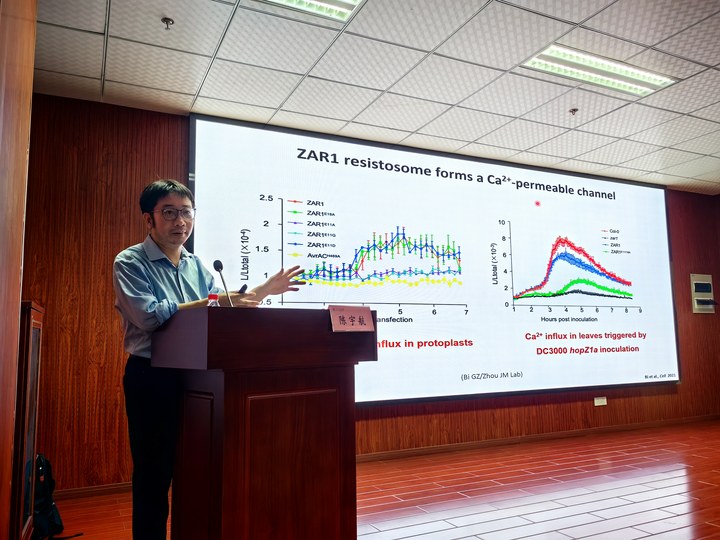 钙信号贯穿植物免疫的信号传导和应答过程,陈宇航研究员介绍了其团队在“ZAR1抗病小体离子通道”,“SR35抗病小体离子通道”和“新型抗病离子通道卫青Weitsing”等多个植物抗病钙离子通道研究的结构和作用机制。研究团队先后发现激活后的五聚体抗病蛋白ZAR1和抗病小体SR35具有钙离子通道活性,可以引起钙离子内流,来激发植物免疫抗病应答。最近,研究团队成功克隆了广谱高抗根肿病基因卫青WTS,可自组装形成新型的五聚体离子通道,定位于内质网上介导钙离子释放。揭示植物免疫激活机制不同于NLR抗病小体介导的免疫应答过程,是一种植物免疫新方式。