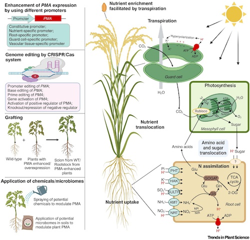 质子泵是一个一级主动运输蛋白,是植物体内一个重要的“主宰酶”,具有其他转运蛋白无法替代的作用。其泵出的H+,不仅能酸化质外体空间,同时也建立并调控细胞膜电位、提供质子驱动力。因此,质子泵在各种养分的获取过程中都发挥着关键作用。进一步探索质子泵在植物营养中的作用机制,有助于将来通过生物技术策略调节质子泵活性,提高作物对土壤养分的获取和利用效率,以及应对全球气候变化带来的对农业生产的影响,对生态友好型农业的发展也具有重要意义。在农业生产中,作物必须应对土壤中可利用养分浓度的波动,如单个养分的缺乏,以及多重养分的胁迫。通过对质子泵基因进行遗传操控调节质子泵活性是一种提高作物对多种养分吸收,同时增强作物对养分缺乏适应性的有效策略。一种潜在的策略是利用组织特异性(如根系特异性或胁迫特异性)启动子来驱动质子泵基因的表达。在园艺植物或林木中将具有增强质子泵活性的转基因植物的砧木与非转基因植物的接穗嫁接,也是提高养分吸收效率和养分胁迫抗性的一种潜在策略。调节质子泵上游调控因子的表达也是调节质子泵活性的一种潜在策略。此外,通过引导编辑对质子泵的某些氨基酸进行改变以调节质子泵的活性,也可用于改良作物的养分吸收与利用效率。