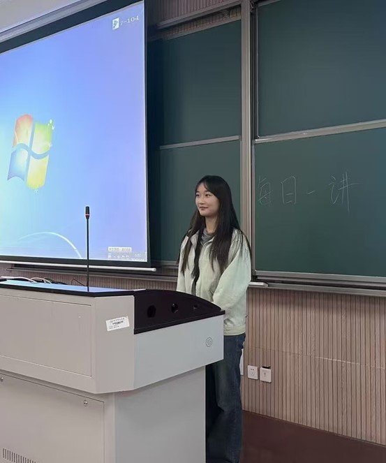 11月12日,生技232班的李梦婷同学在勤园7号楼103教室以《以吾辈萤萤之火,燃祖国闪闪之光》为题,向在座同学们发表了一场鼓舞人心的演讲。