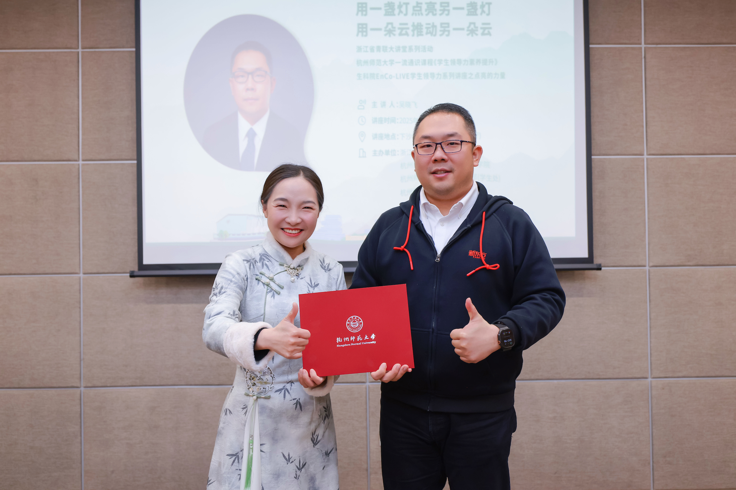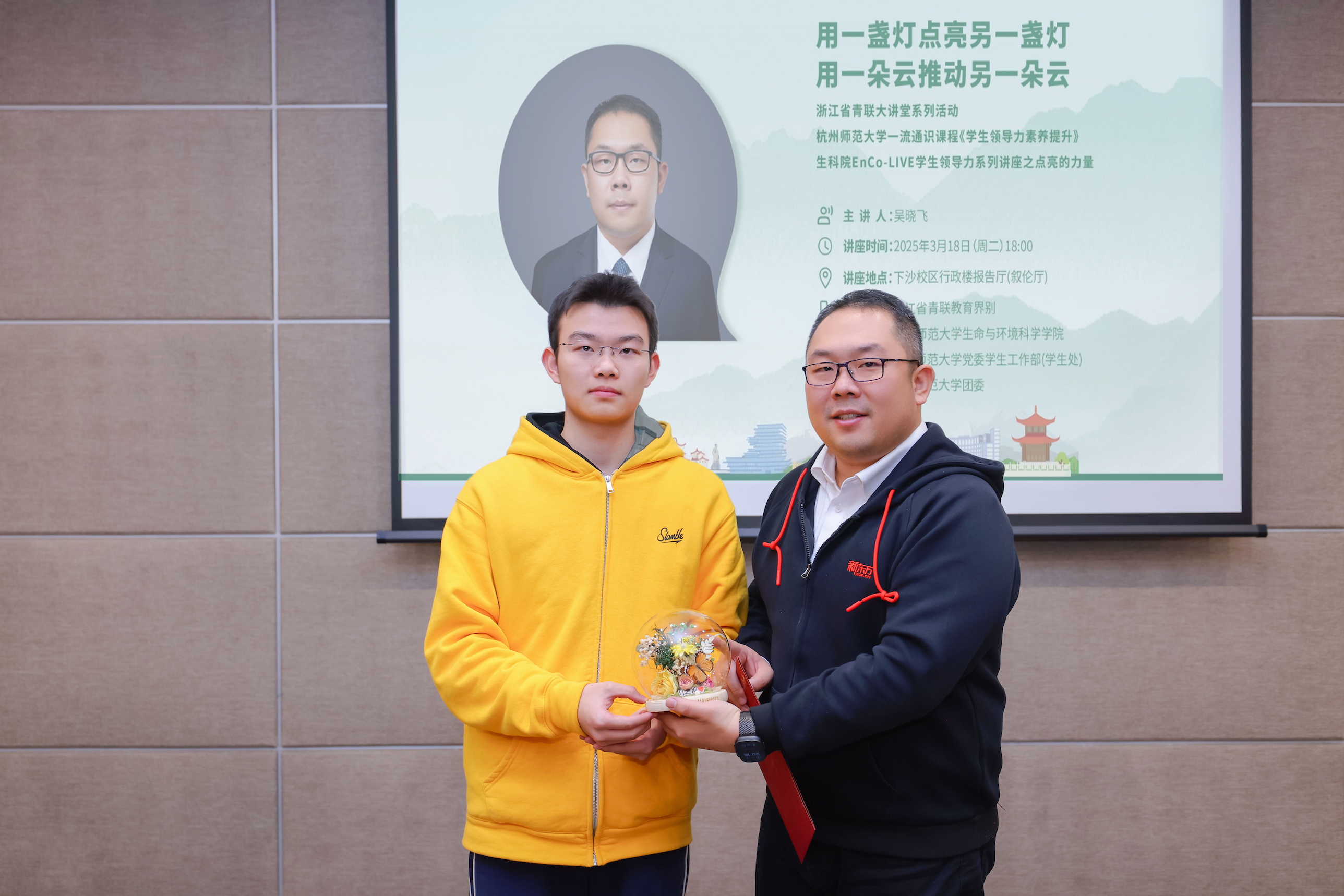 2025年3月18日晚,浙江省青联大讲堂走进杭师大,省青联常委、新东方集团副总裁、浙江新东方党委书记吴晓飞做了题为“点亮的力量——用一盏灯点亮另一盏灯,用一朵云推动另一朵云”的讲座。讲座与杭师大一流通识课程《学生领导力素养提升》、成人小说 EnCo-LIVE学生领导力系列讲座相结合,由浙江省青联教育界别、杭师大成人小说 、学工部(学生处)与校团委联合组织,省青联委员、中核运维技术有限公司高级工程师徐中,浙江新东方人力资源总监助理张明亮、创新业务部行政党建经理陈佳出席,省青联委员、成人小说 党委副书记王倩主持,近200名师生参加。