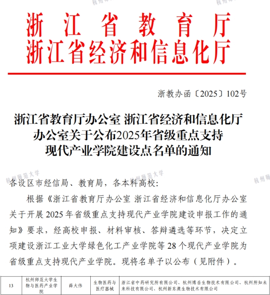 近日,浙江省教育厅办公室、浙江省经济和信息化厅办公室联合发布了《关于公布2025年度省级重点支持现代产业学院建设名单的通知》,由成人小说 牵头的成人小说 生物与医药产业学院成功获批。
