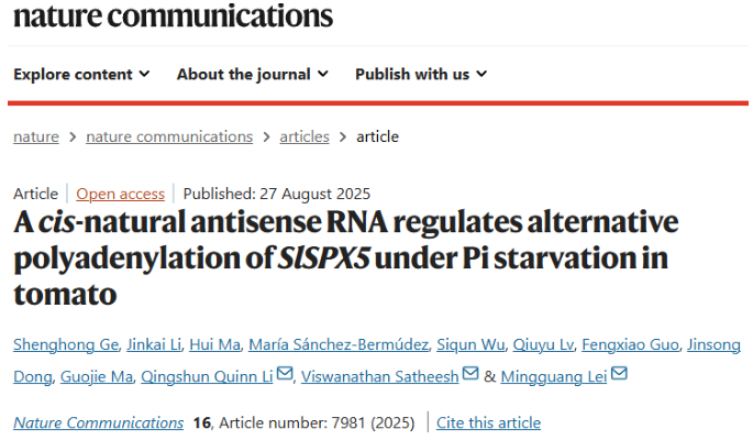2025年8月27日,《Nature Communications》在线发表了成人小说 雷明光研究组题为“A cis-natural antisense RNA regulates alternative polyadenylation ofSlSPX5 under Pi starvation in tomato”的研究论文。该研究首次揭示了番茄通过顺式天然反义转录(cis-NAT)调控基因多聚腺苷酸化响应磷饥饿的新机制,为作物磷高效利用提供了全新理论依据。
