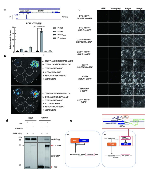 通过深入研究,团队发现磷饥饿条件可特异性诱导SlSPX5基因座转录产生一种顺式天然反义转录本NATSPX5。进一步机制研究表明,NATSPX5的表达可引起RNA聚合酶II在SlSPX5基因5'端发生转录暂停,进而导致其羧基末端结构域(CTD)第2位丝氨酸(Ser2)发生磷酸化修饰,招募多聚腺苷酸化复合物SlCPSF30和SlHLP1,从而促使SlSPX5优先使用近端多聚腺苷酸化位点,最终生成缩短的非功能性转录本(图3)。