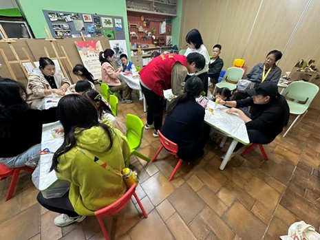 志愿者们帮助小朋友们制作干花团扇