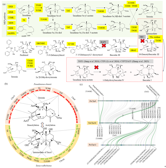 进化分析表明,在五个具有完整基因组的红豆杉科植物中,香榧是红豆杉科中最古老的植物。随着红豆杉科的出现,白豆杉已经进化出具有紫杉二烯合酶活性的TPS基因,并在大约48.3 百万年前从香榧中分化出来。尽管白豆杉已经具有紫杉烷生物合成的初始阶段,但它只拥有紫杉醇生物合成途径的部分基因,该途径在负责合成10-脱乙酰基巴卡丁III的酶(称为TBT)产生之前终止。大约24.3至25.6百万年前,红豆杉属的进化形成了一个与白豆杉谱系不同的独立的分支。随着红豆杉属的形成,TBT缺失造成的局限性得到了解决,扩展了白豆杉中现有紫杉烷生物合成途径,形成了完整的紫杉醇生物合成途径(图1)。